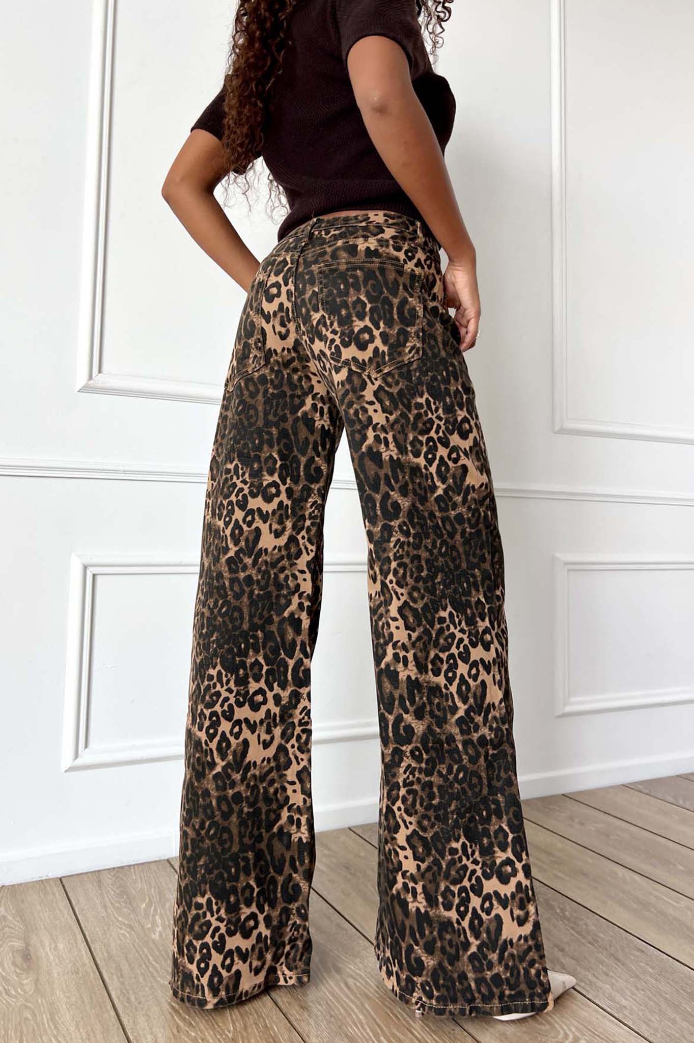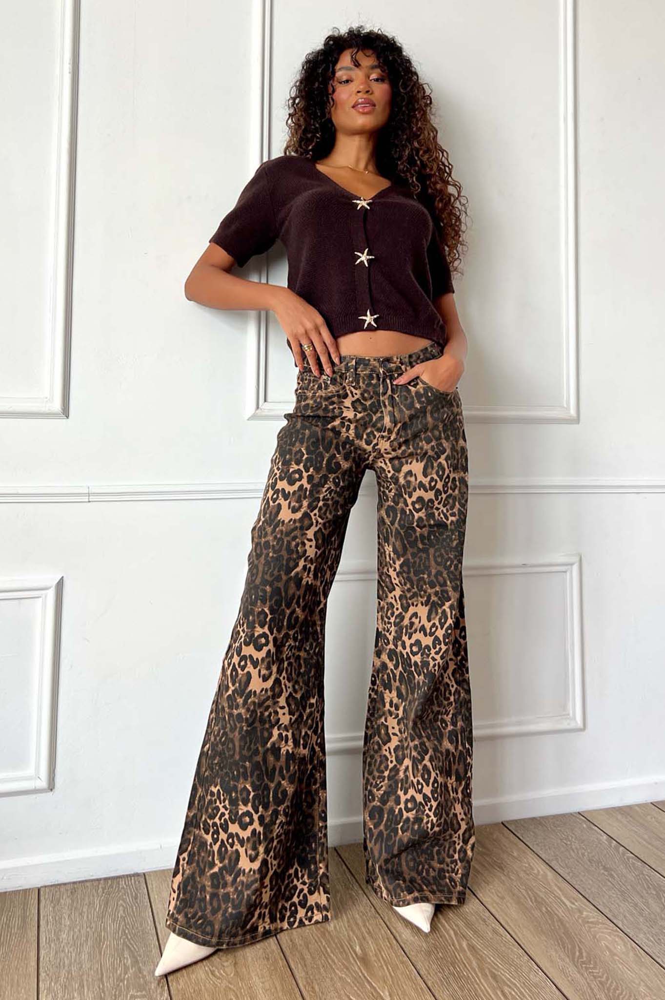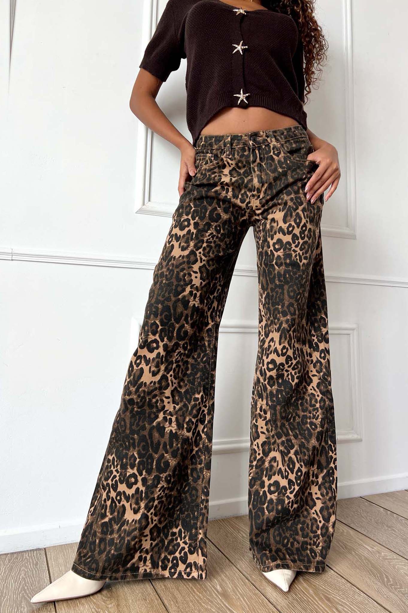Flare παντελόνι με λεοπάρ σχέδιο. Εφαρμοστό στους γλουτούς, άνοιγμα στο τελείωμα. Μήκος 108cm, μέση 140cm.