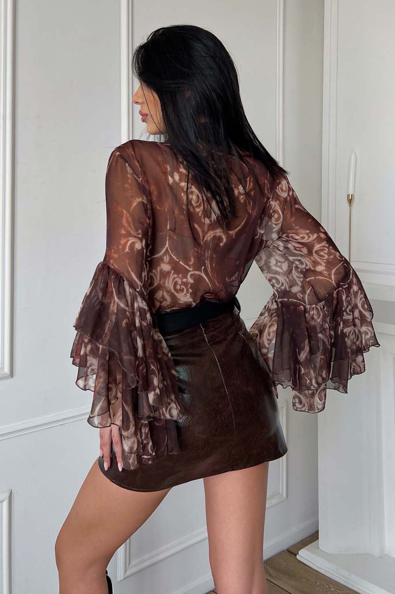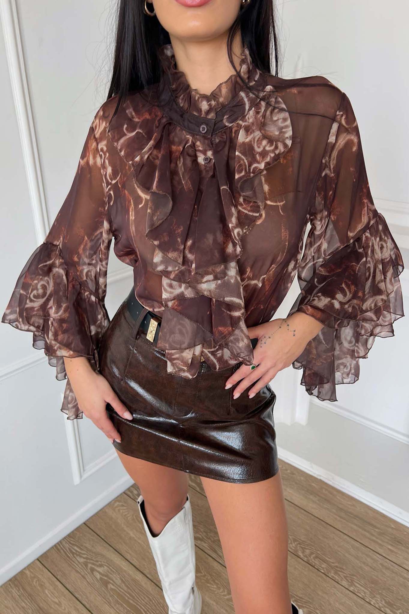 Εμπριμέ πουκάμισο με βολάν. Μήκος 64cm, στήθος 60cm, μανίκι 50cm