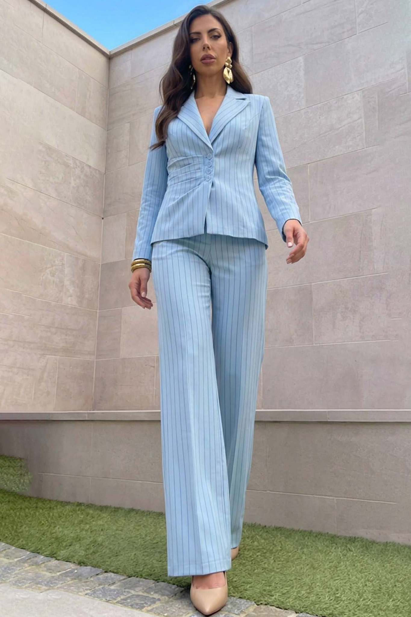 Σετ Κοστούμι Σακάκι με Σούρες & Παντελόνα. Διαθέτει μεσάτη εφαρμογή που κολακεύει τη μέση και ιδιαίτερες σούρες στο πλάι που δίνουν κίνηση και στυλ.
