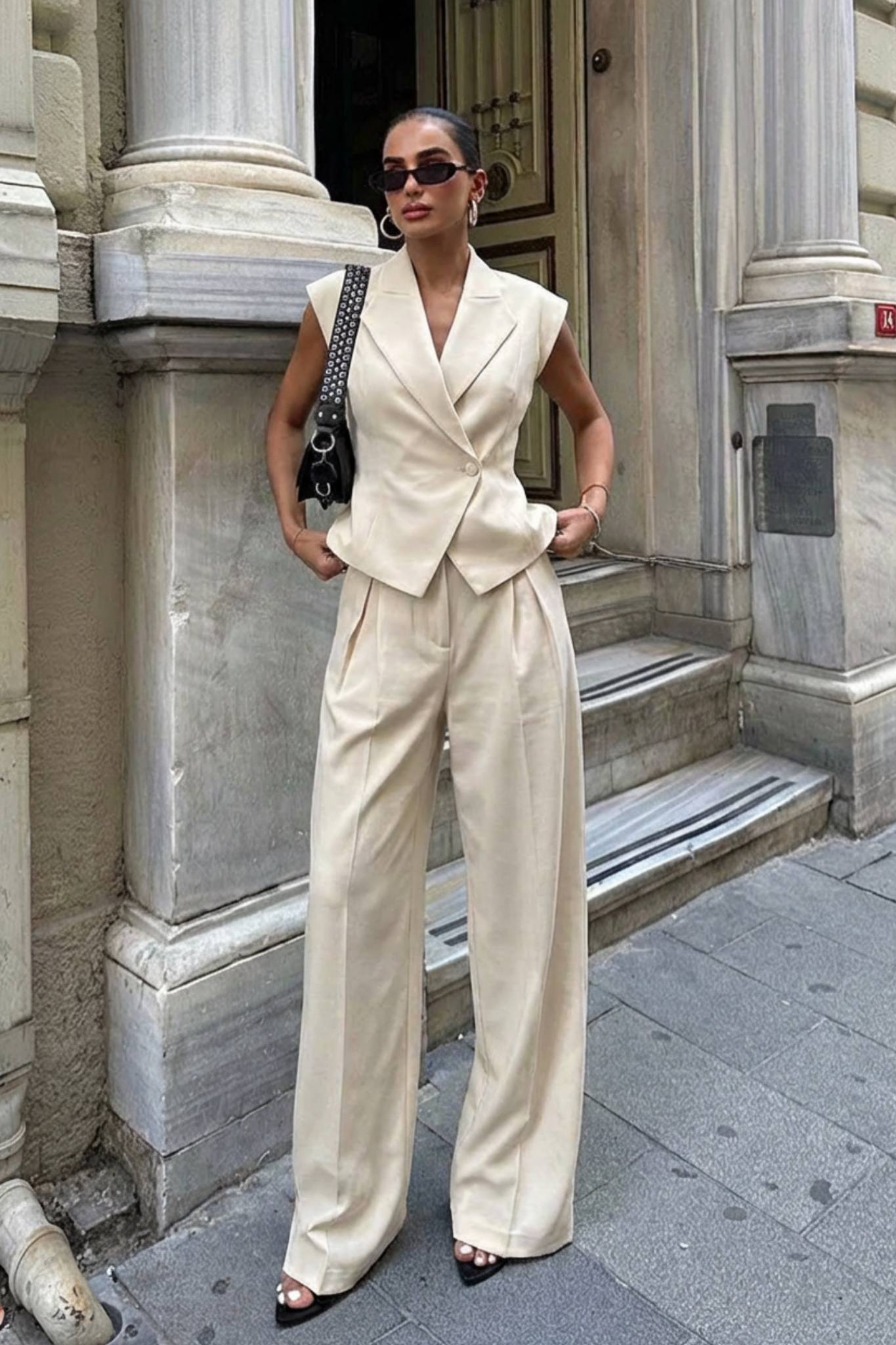 Κομψό γυναικείο σετ ιδανικό για σικ εμφανίσεις. Αποτελείται από αμάνικο σακάκι με γιακά και ζώνη που δένει στη μέση, αναδεικνύοντας τη σιλουέτα, και παντελόνι σε φαρδιά γραμμή με πιέτες για άνεση και στυλ. Κατασκευασμένο από ελαφρύ ύφασμα, προσφέρει άνεση όλη μέρα και μπορεί να φορεθεί τόσο σε επαγγελματικές όσο και σε casual chic περιστάσεις.