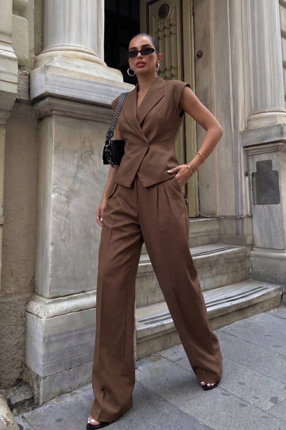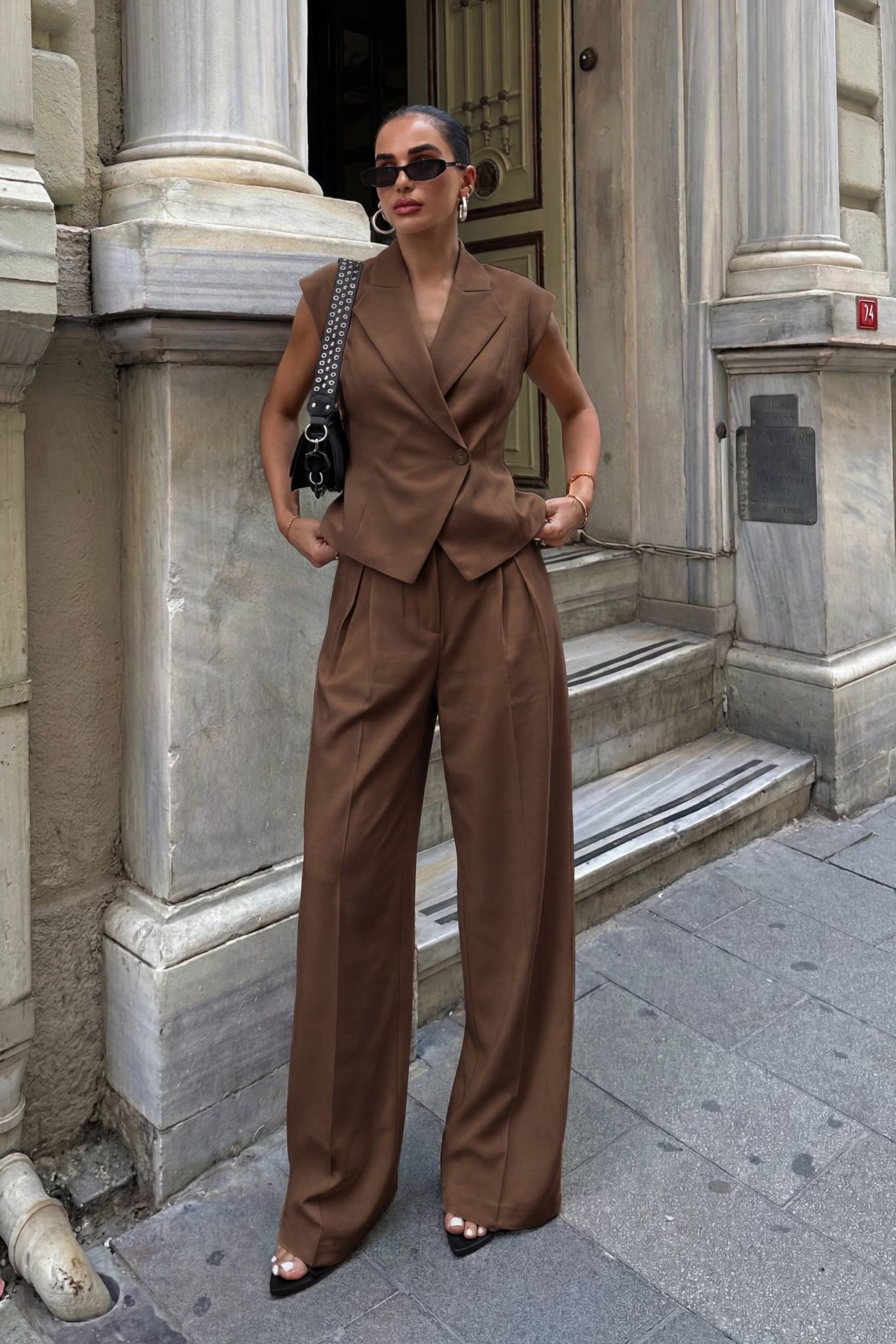 Κομψό γυναικείο σετ ιδανικό για σικ εμφανίσεις. Αποτελείται από αμάνικο σακάκι με γιακά και ζώνη που δένει στη μέση, αναδεικνύοντας τη σιλουέτα, και παντελόνι σε φαρδιά γραμμή με πιέτες για άνεση και στυλ. Κατασκευασμένο από ελαφρύ ύφασμα, προσφέρει άνεση όλη μέρα και μπορεί να φορεθεί τόσο σε επαγγελματικές όσο και σε casual chic περιστάσεις.