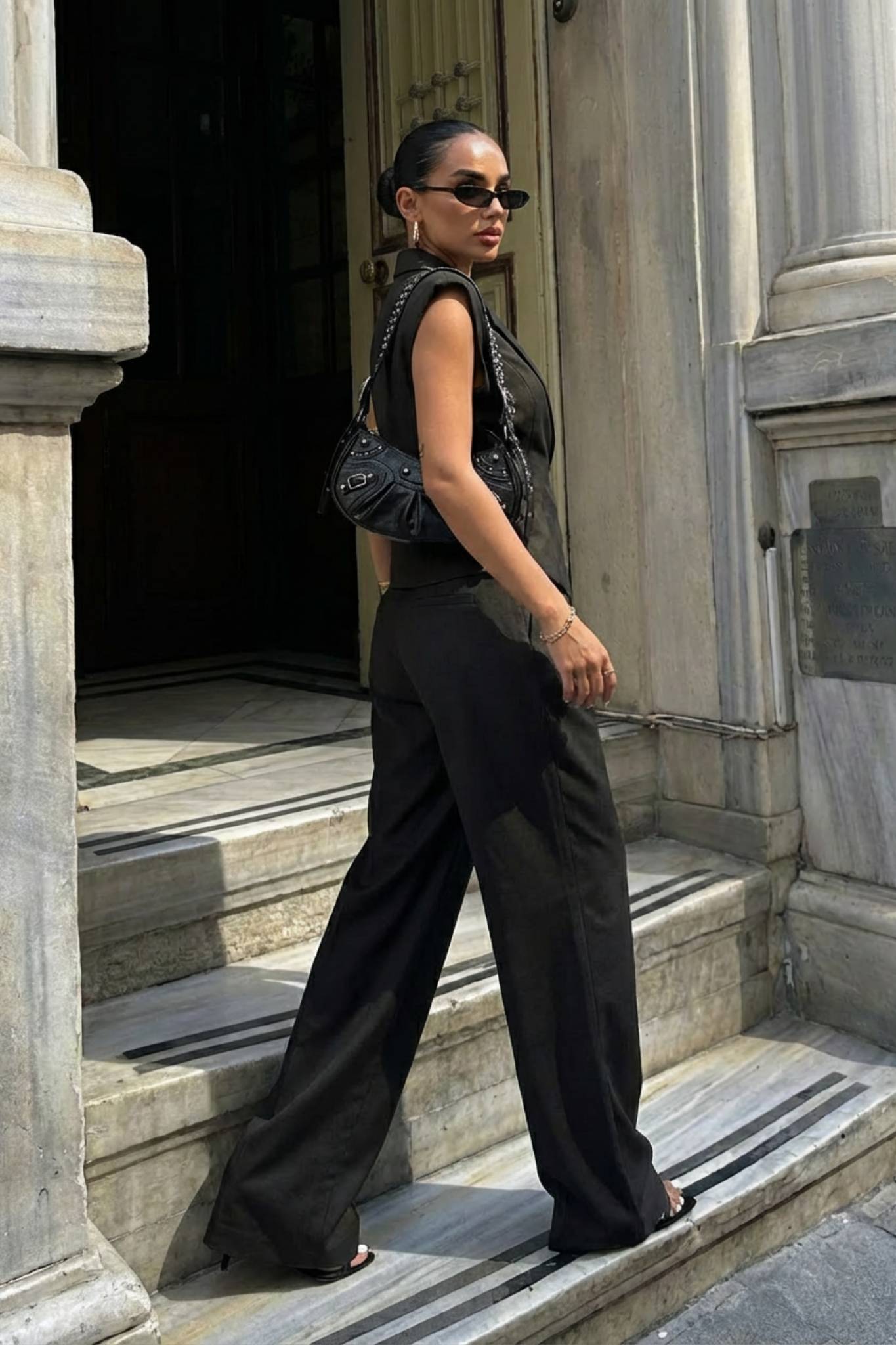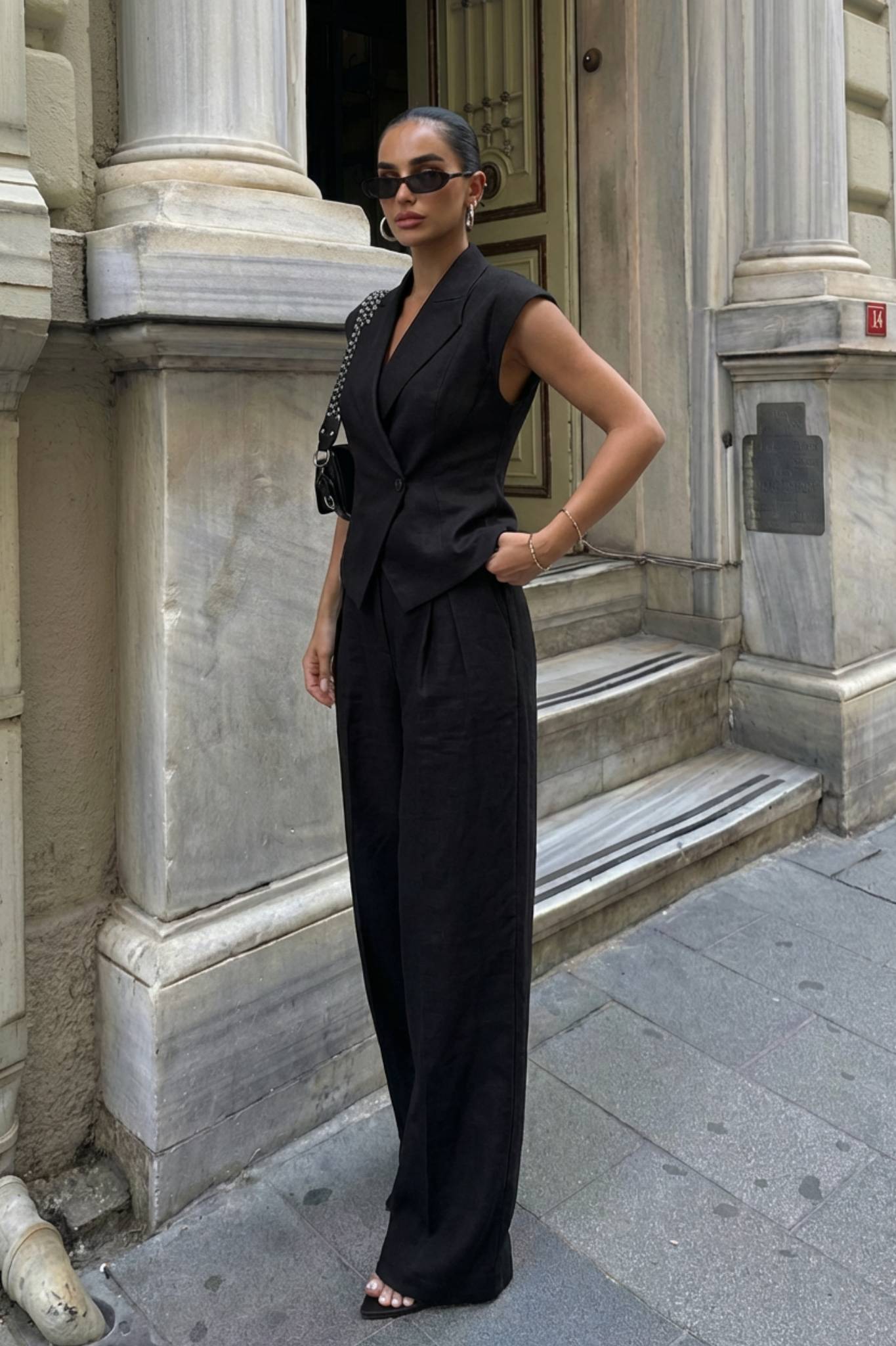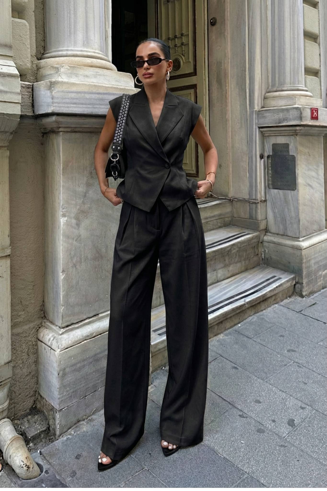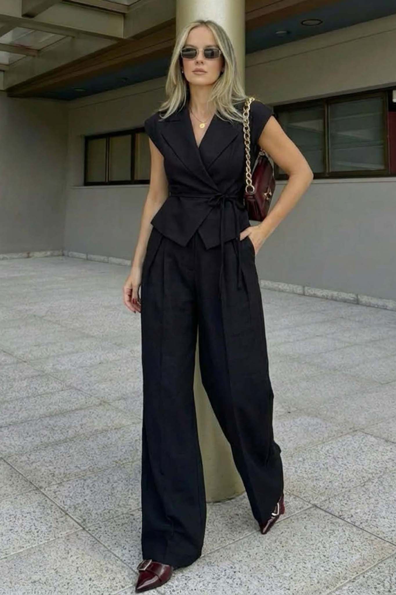 Κομψό γυναικείο σετ ιδανικό για σικ εμφανίσεις. Αποτελείται από αμάνικο σακάκι με γιακά και ζώνη που δένει στη μέση, αναδεικνύοντας τη σιλουέτα, και παντελόνι σε φαρδιά γραμμή με πιέτες για άνεση και στυλ. Κατασκευασμένο από ελαφρύ ύφασμα, προσφέρει άνεση όλη μέρα και μπορεί να φορεθεί τόσο σε επαγγελματικές όσο και σε casual chic περιστάσεις.