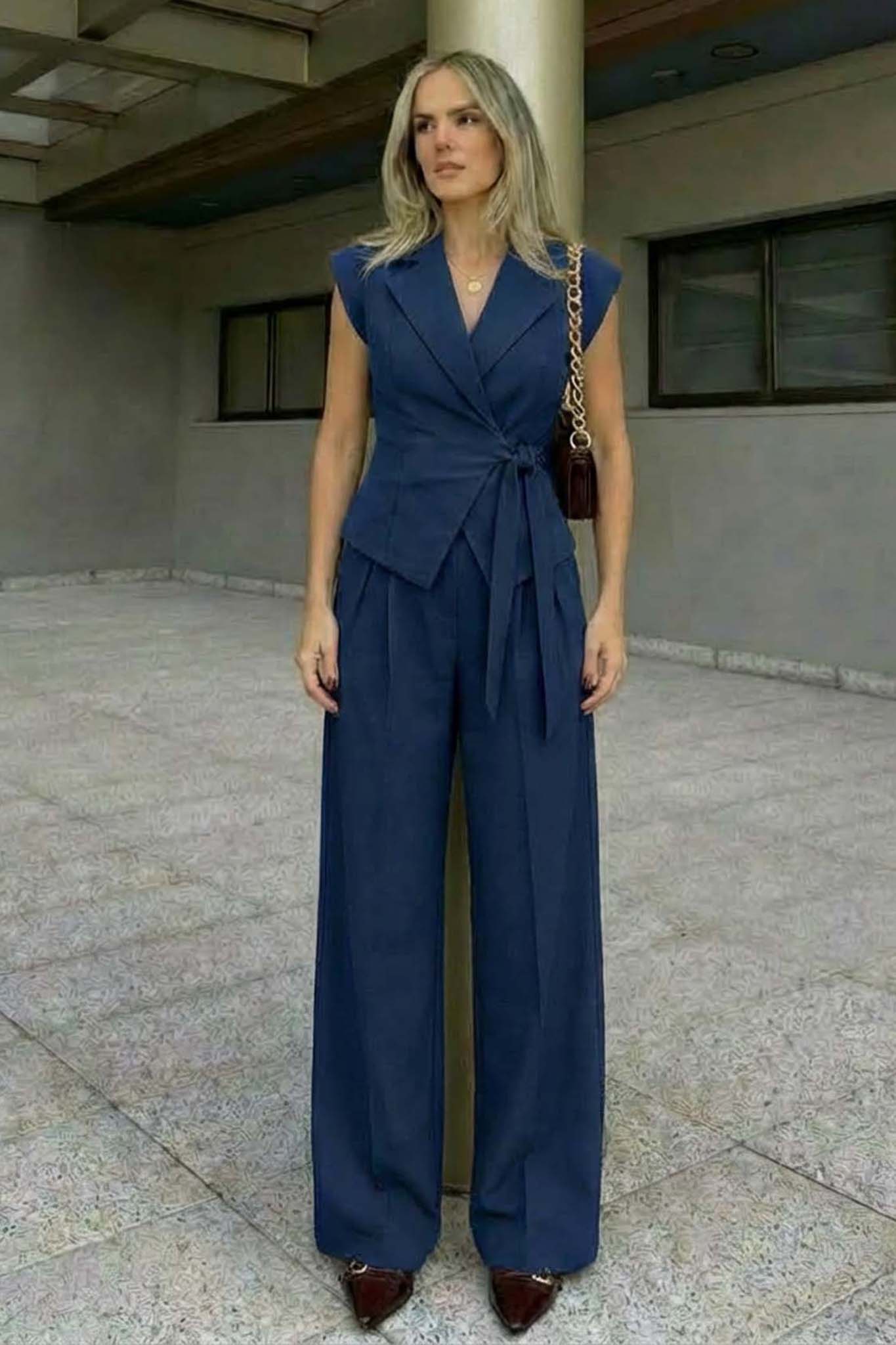 Κομψό γυναικείο σετ ιδανικό για σικ εμφανίσεις. Αποτελείται από αμάνικο σακάκι με γιακά και ζώνη που δένει στη μέση, αναδεικνύοντας τη σιλουέτα, και παντελόνι σε φαρδιά γραμμή με πιέτες για άνεση και στυλ. Κατασκευασμένο από ελαφρύ ύφασμα, προσφέρει άνεση όλη μέρα και μπορεί να φορεθεί τόσο σε επαγγελματικές όσο και σε casual chic περιστάσεις.
