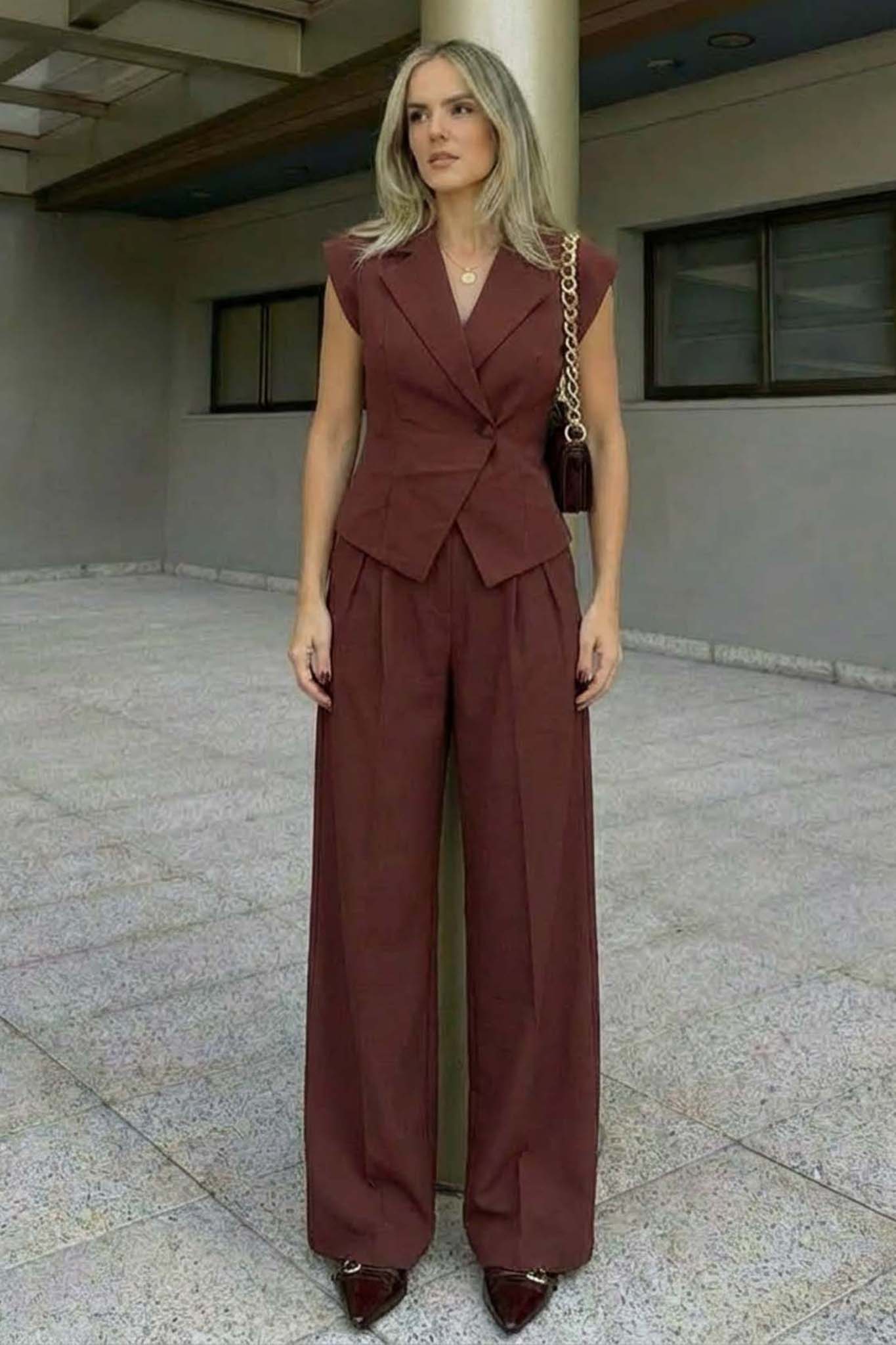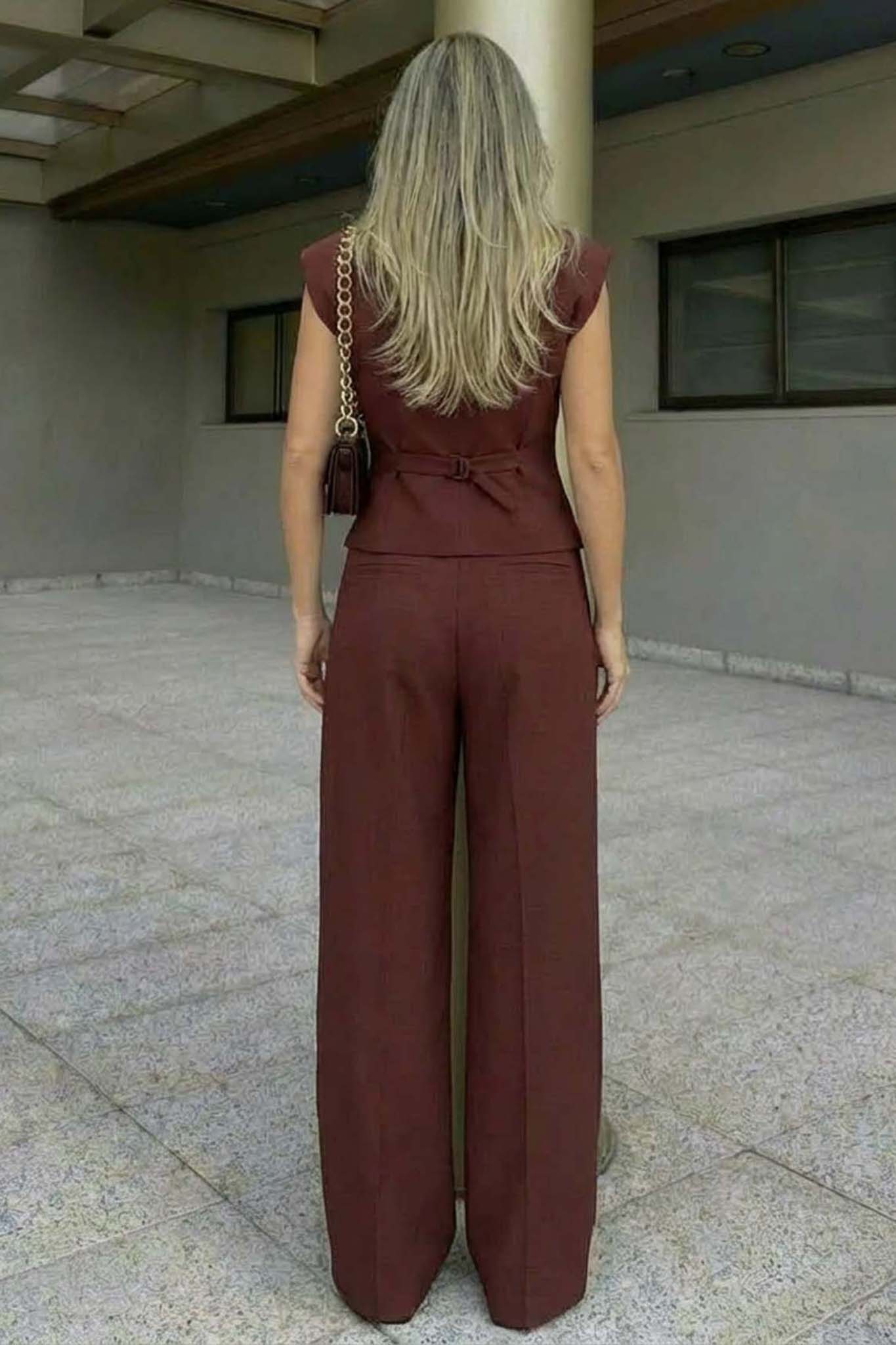 Κομψό γυναικείο σετ ιδανικό για σικ εμφανίσεις. Αποτελείται από αμάνικο σακάκι με γιακά και ζώνη που δένει στη μέση, αναδεικνύοντας τη σιλουέτα, και παντελόνι σε φαρδιά γραμμή με πιέτες για άνεση και στυλ. Κατασκευασμένο από ελαφρύ ύφασμα, προσφέρει άνεση όλη μέρα και μπορεί να φορεθεί τόσο σε επαγγελματικές όσο και σε casual chic περιστάσεις.