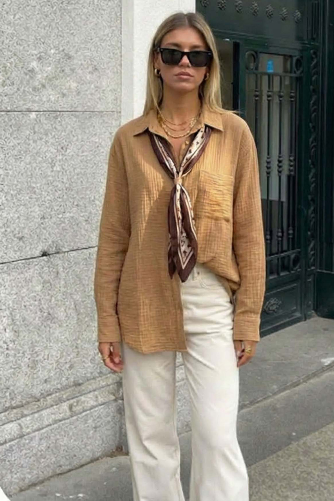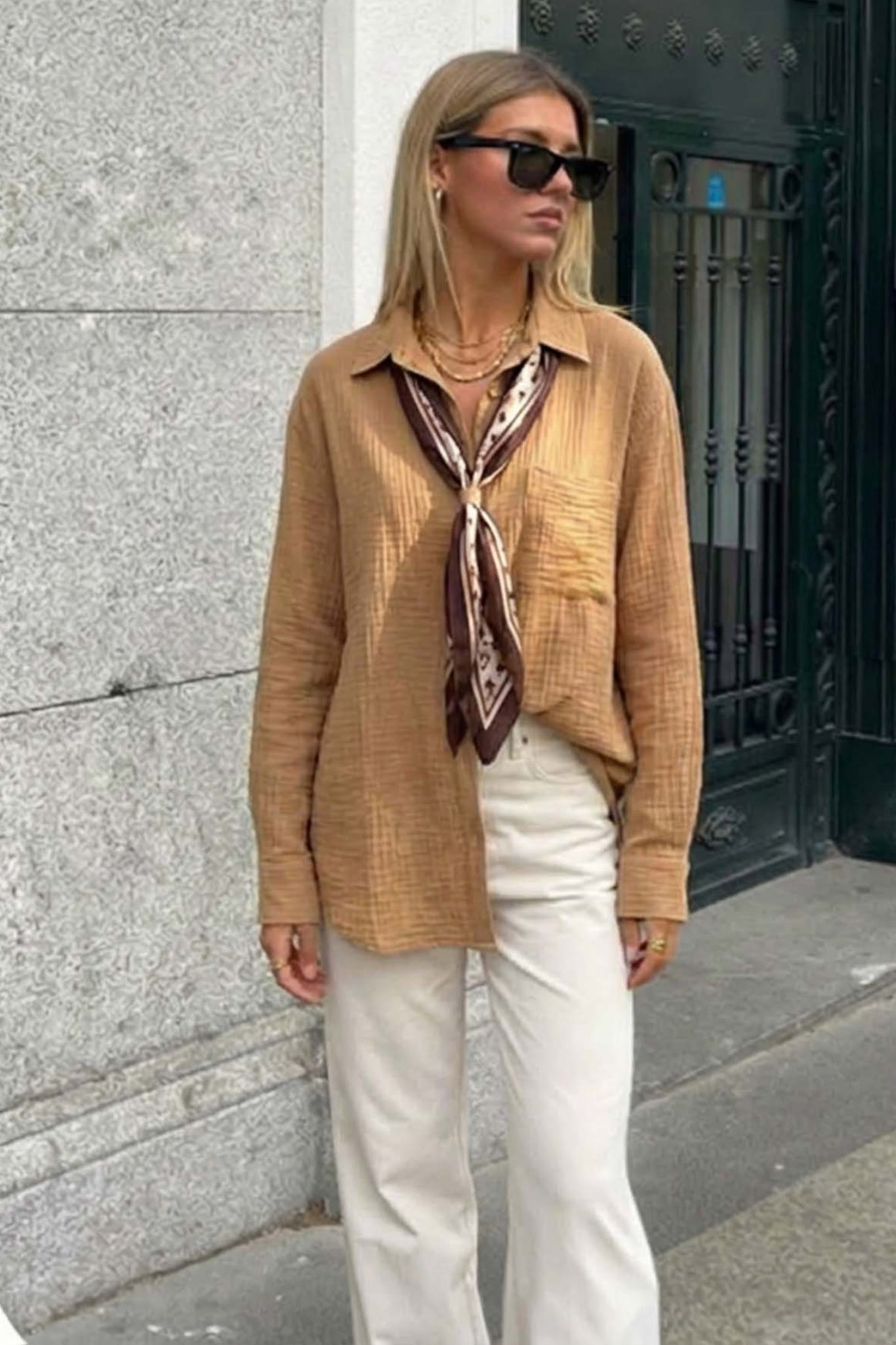 Ανανεώστε το στυλ σας με αυτήν τη μακρυμάνικη μπλούζα σε ζεστή καμηλό απόχρωση, κατασκευασμένη από ελαφρύ, ανάγλυφο ύφασμα για άνεση και κομψότητα όλη μέρα. Διαθέτει χαλαρή γραμμή, κλασικό γιακά και τσέπη στο στήθος, προσφέροντας ευελιξία για casual ή πιο προσεγμένες εμφανίσεις. Ιδανική για συνδυασμούς με παντελόνια ή φούστες, προσθέτοντας μια διακριτική πινελιά κομψότητας στην καθημερινότητά σας.