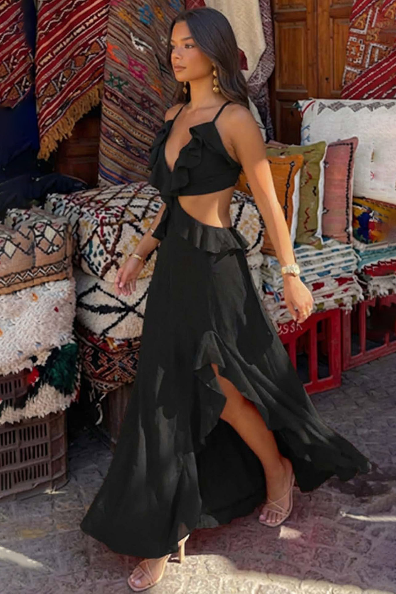 Μάξι φόρεμα με cut out στη μέση, σκίσιμο στο πλάι και βολάν. Ιδανικό για ιδιαίτερες περιστάσεις που θα εντυπωσιάσει.