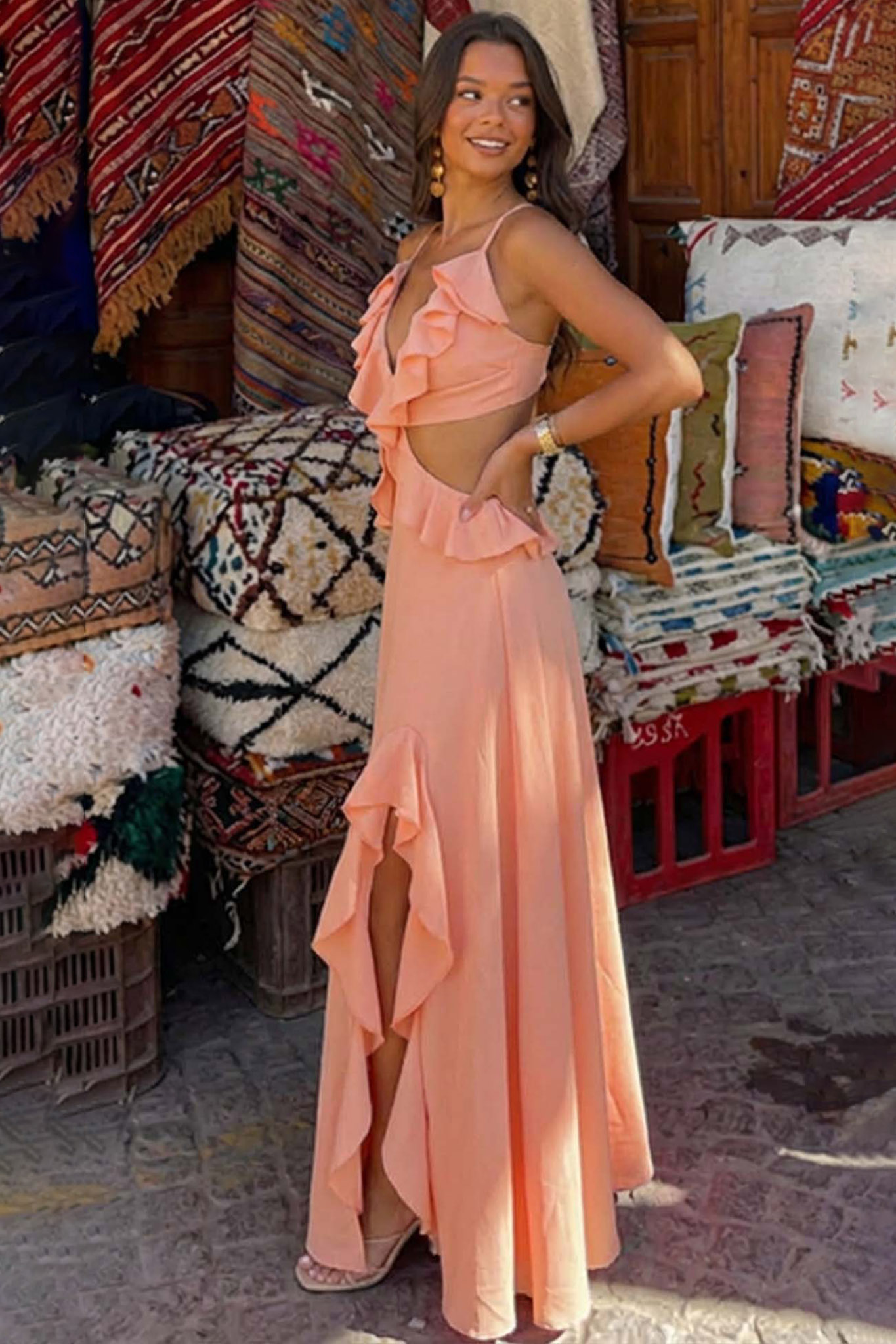 Μάξι φόρεμα με cut out στη μέση, σκίσιμο στο πλάι και βολάν. Ιδανικό για ιδιαίτερες περιστάσεις που θα εντυπωσιάσει.