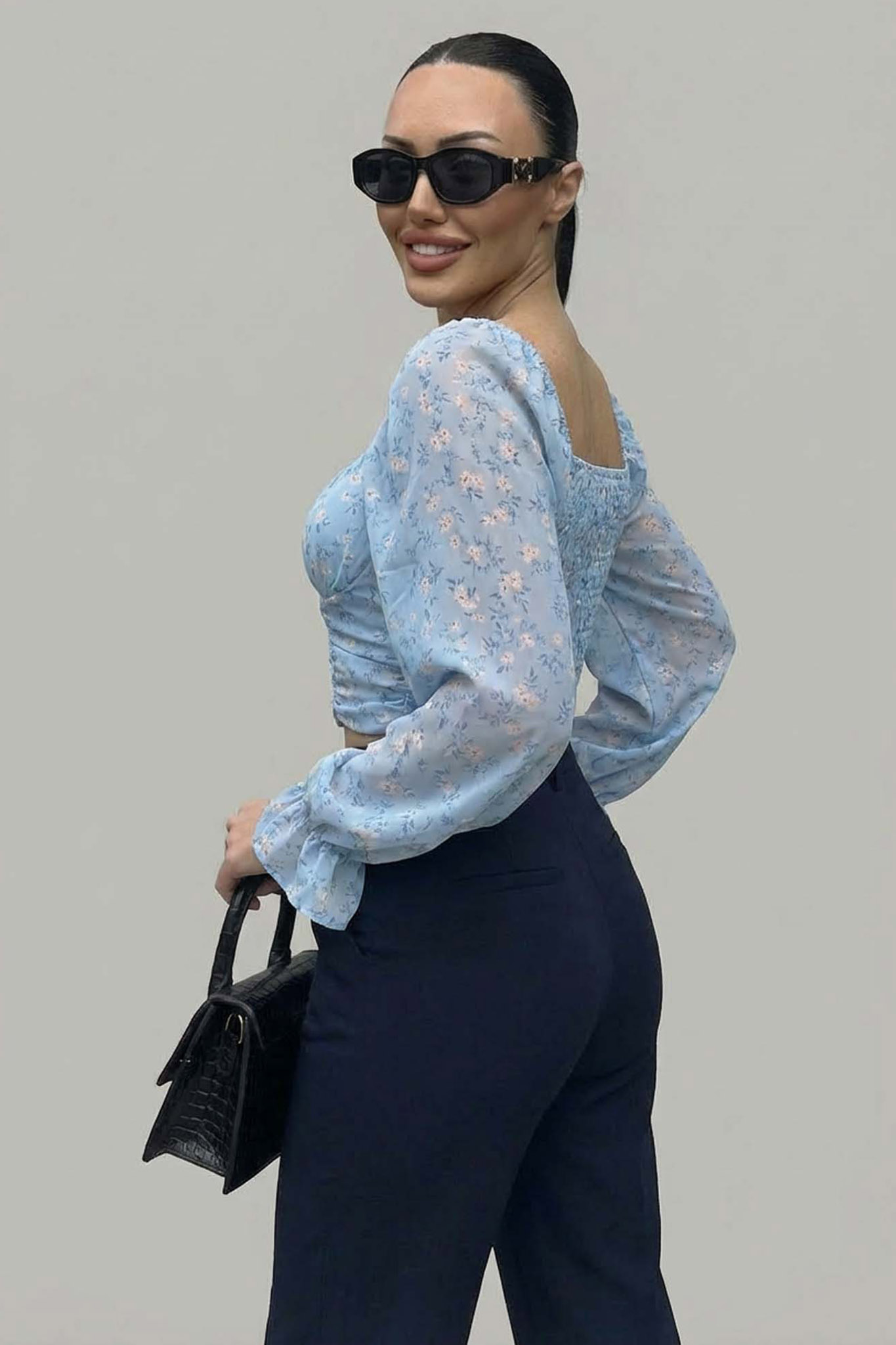 Floral cropped μπλούζα συνδυάζει τη ρομαντική αισθητική με τις σύγχρονες τάσεις. Διαθέτει θηλυκή τετράγωνη λαιμόκοψη, εντυπωσιακά ημιδιάφανα balloon μανίκια και λεπτομέρειες με σούρες. Mήκος 42cm, στήθος 40cm, μανίκι 65cm.