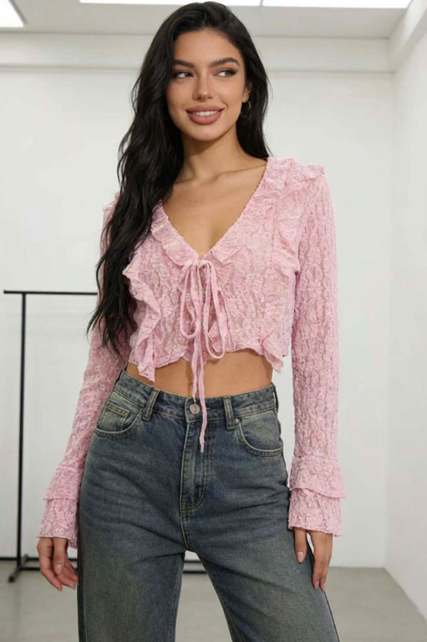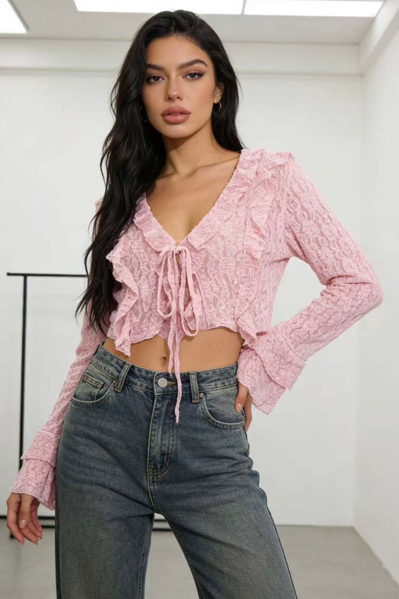 Δαντελένιο ζακετάκι 2 σε 1, το οποίο μπορεί να φορεθεί τόσο ως crop top (μπλούζα) όσο και ως layering κομμάτι (ζακέτα), προσφέροντας ευελιξία στο styling.