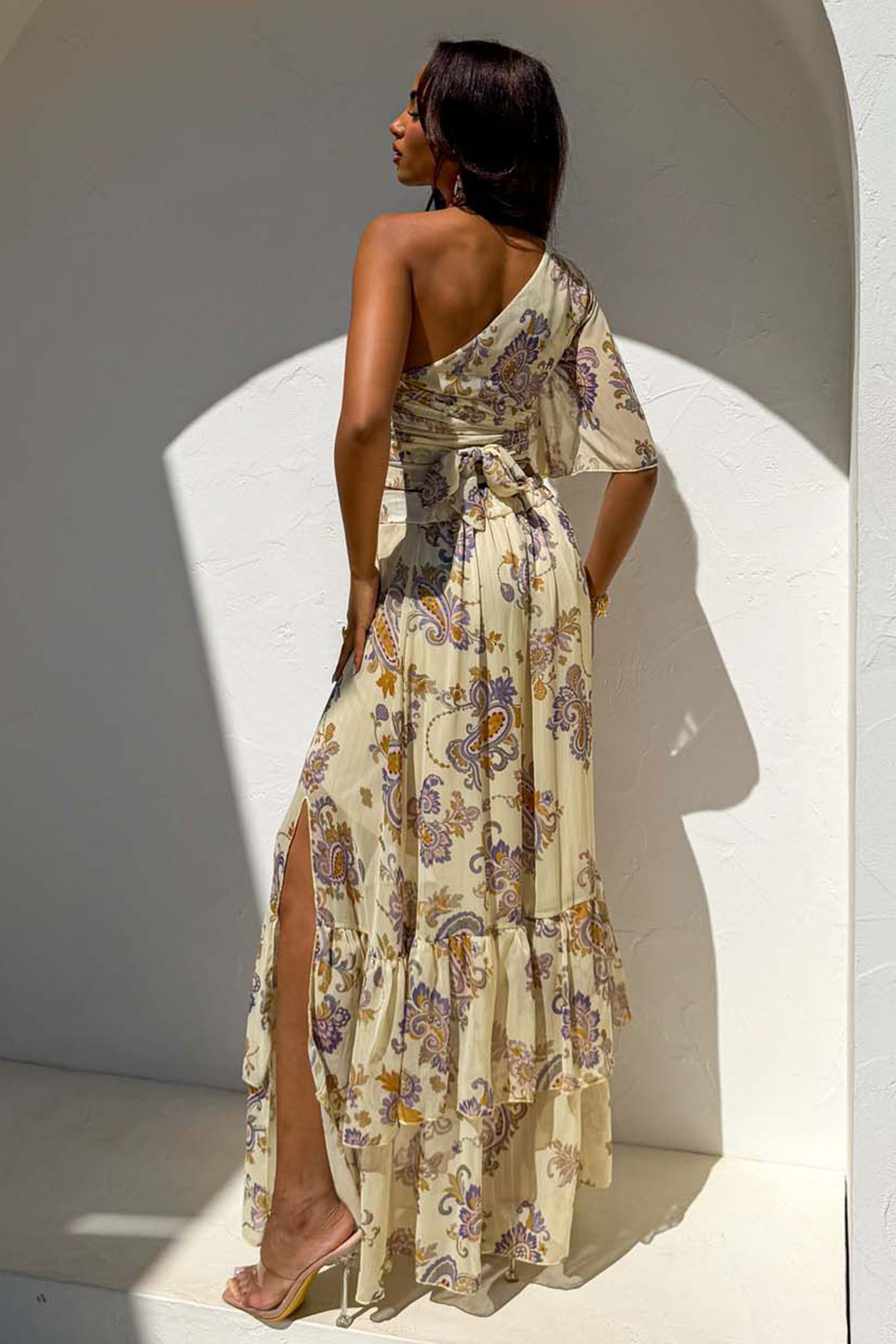 Αέρινο φόρεμα σε άλφα γραμμή με μοτίβο λαχούρι, το οποίο διαθέτει ντεκολτέ σε σχήμα V, μανίκια τριών τετάρτων και χαρακτηριστικό δέσιμο με φιόγκο στο πλάι της μέσης που καταλήγει σε βολάν στο κάτω μέρος.