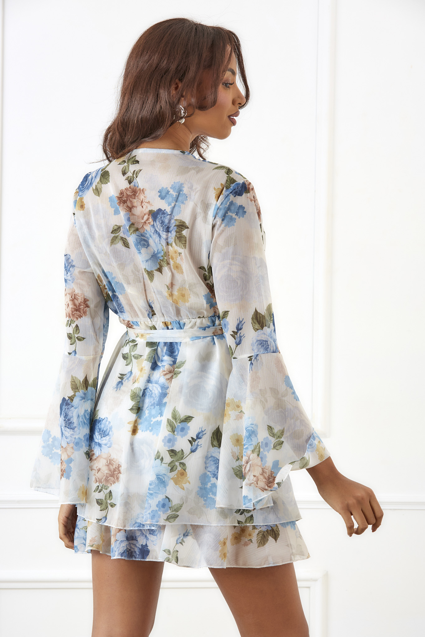 Μίνι φόρεμα φλοράλ κρουαζέ με ζωνάκι στη μέση και ανοιγμα στα μανίκια.