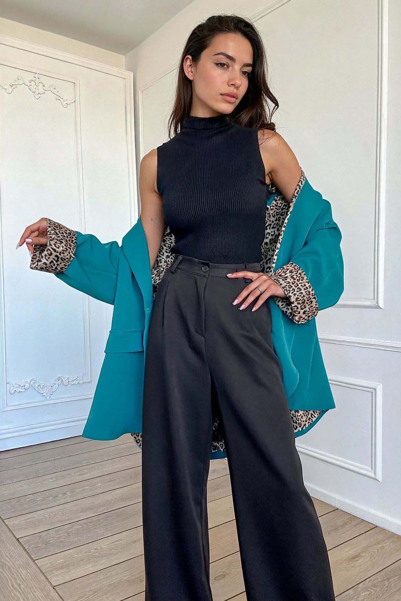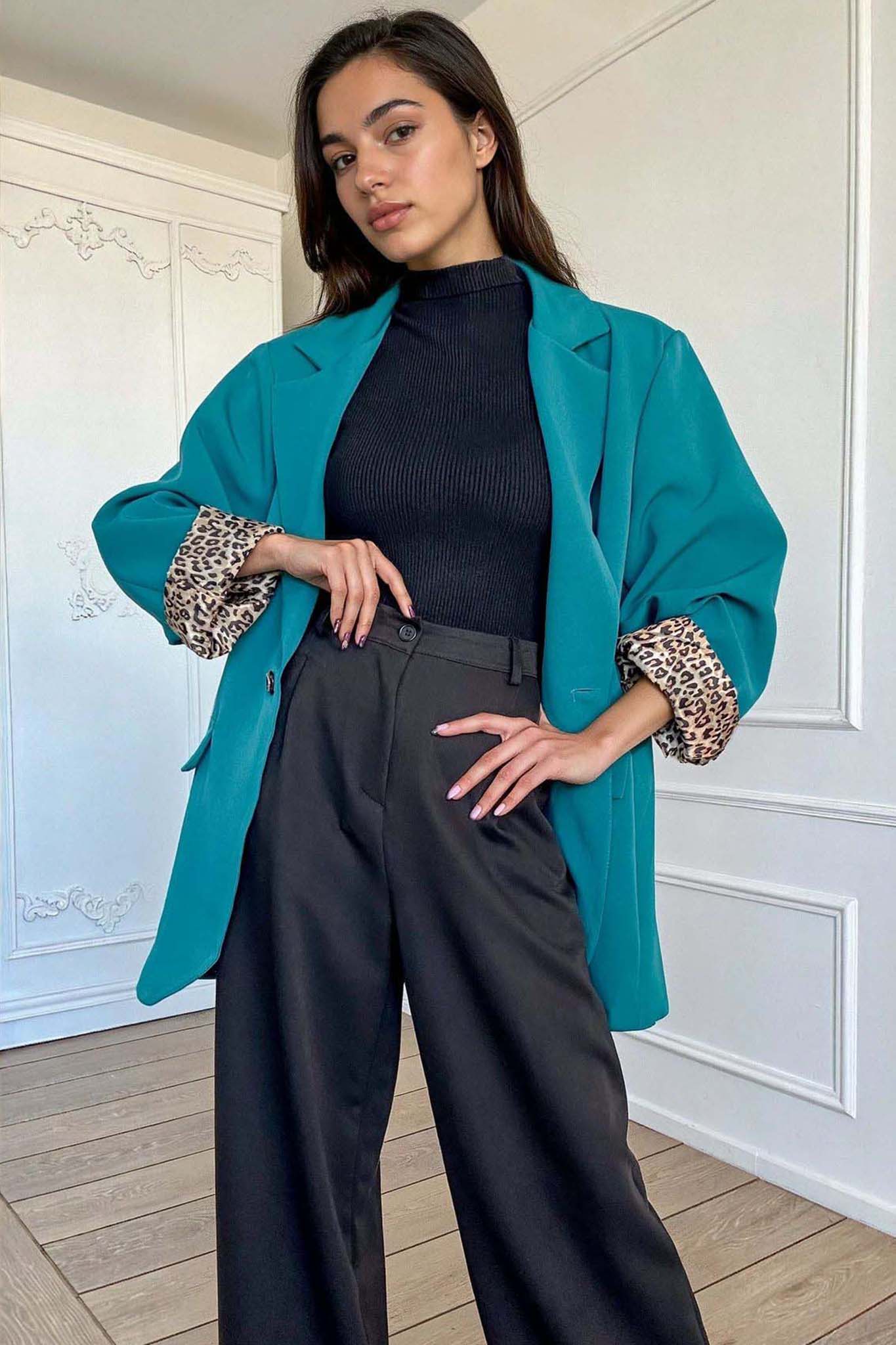 Σακάκι oversized με φαρδιά γραμμή και κούμπωμα με κουμπί μπροστά. Διαθέτει επίσης μπροστινές τσέπες και μυτερό γιακά. Οι μανσέτες του σακακιού είναι γυρισμένες προς τα έξω, αποκαλύπτοντας ένα λεοπάρ σχέδιο, προσθέτοντας μια ιδιαίτερη πινελιά. Μήκος 77cm, στήθος 63cm, μανίκι 48cm.