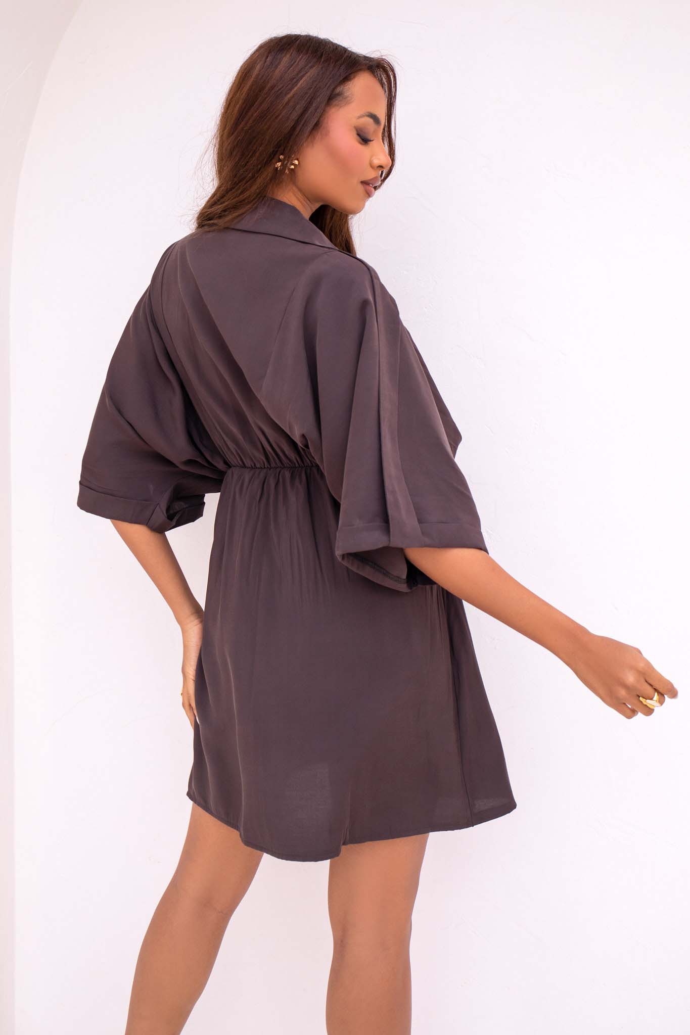 Miνι φόρεμα με γιακά και κοντά, φαρδιά μανίκια που καταλήγουν σε ρεβέρ. Το σχέδιο ξεχωρίζει για την ελαστική μέση και το έντονο ντραπέ εφέ στο μπροστινό μέρος που δημιουργεί μια κομψή σιλουέτα.