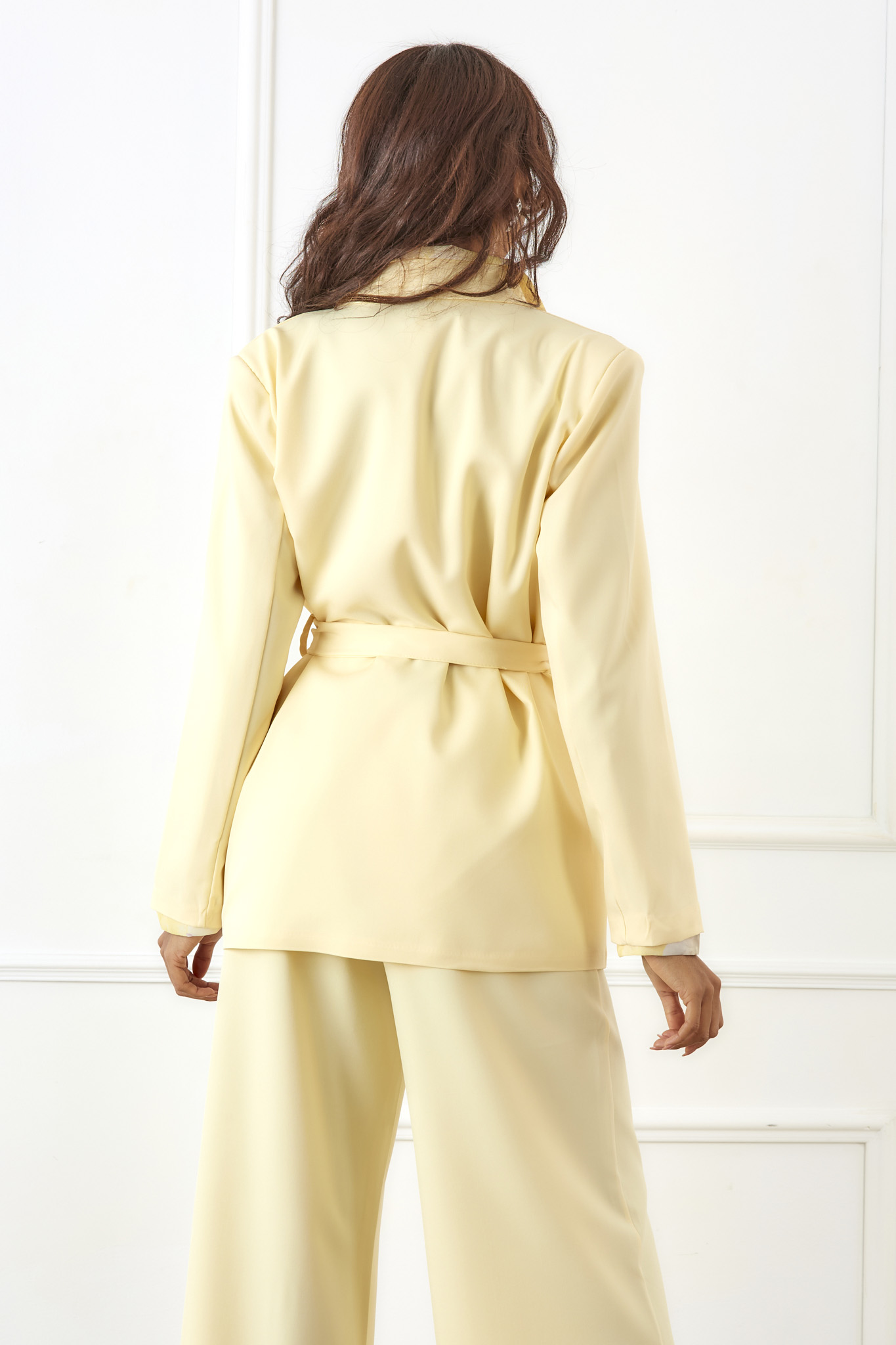 Σετ κοστούμι με σακάκι Blazer, ζώνη και παντελόνι. Αποτελείται από ένα blazer σακάκι με πέτο, το οποίο διαθέτει ενσωματωμένη υφασμάτινη ζώνη που δένει στη μέση για να τονίζει τη σιλουέτα, και ένα παντελόνι σε άνετη, ίσια γραμμή που συχνά περιλαμβάνει λάστιχο στη μέση για καλύτερη εφαρμογή.