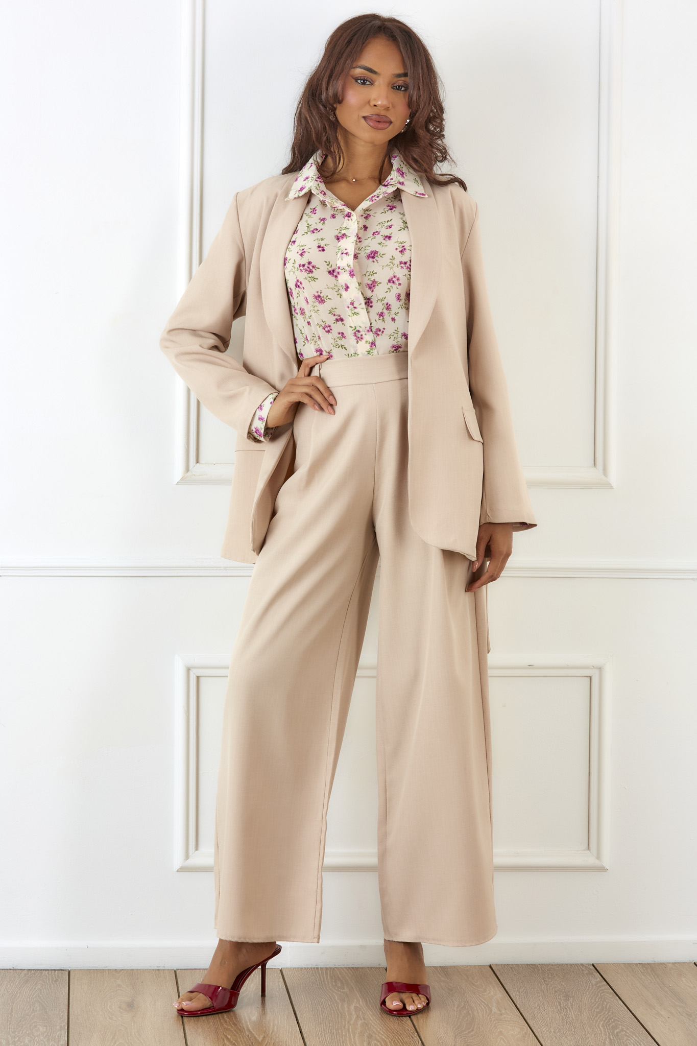Σετ κοστούμι με σακάκι Blazer, ζώνη και παντελόνι. Αποτελείται από ένα blazer σακάκι με πέτο, το οποίο διαθέτει ενσωματωμένη υφασμάτινη ζώνη που δένει στη μέση για να τονίζει τη σιλουέτα, και ένα παντελόνι σε άνετη, ίσια γραμμή που συχνά περιλαμβάνει λάστιχο στη μέση για καλύτερη εφαρμογή.