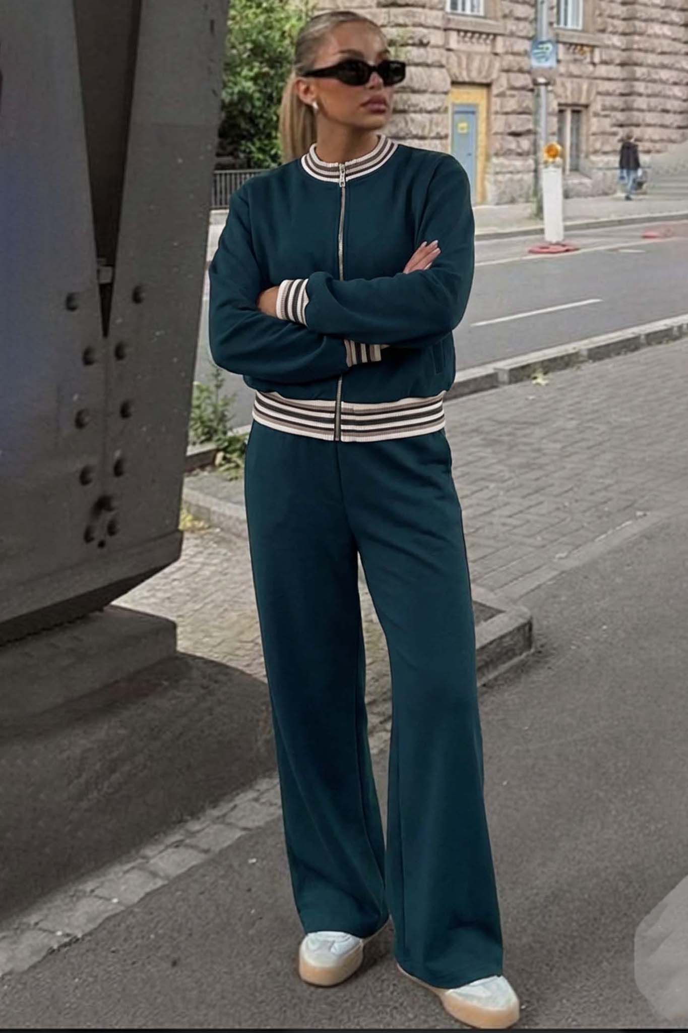 Σετ φόρμας είναι ένα κομψό και μοντέρνο σύνολο δύο τεμαχίων. Αποτελείται από ένα κοντό τζάκετ τύπου bomber με φερμουάρ, το οποίο διαθέτει ριγέ λευκές/μπεζ λεπτομέρειες στον όρθιο γιακά, στις μανσέτες και στο τελείωμα, και ένα ασορτί ψηλόμεσο παντελόνι με πολύ φαρδιά γραμμή (wide leg).