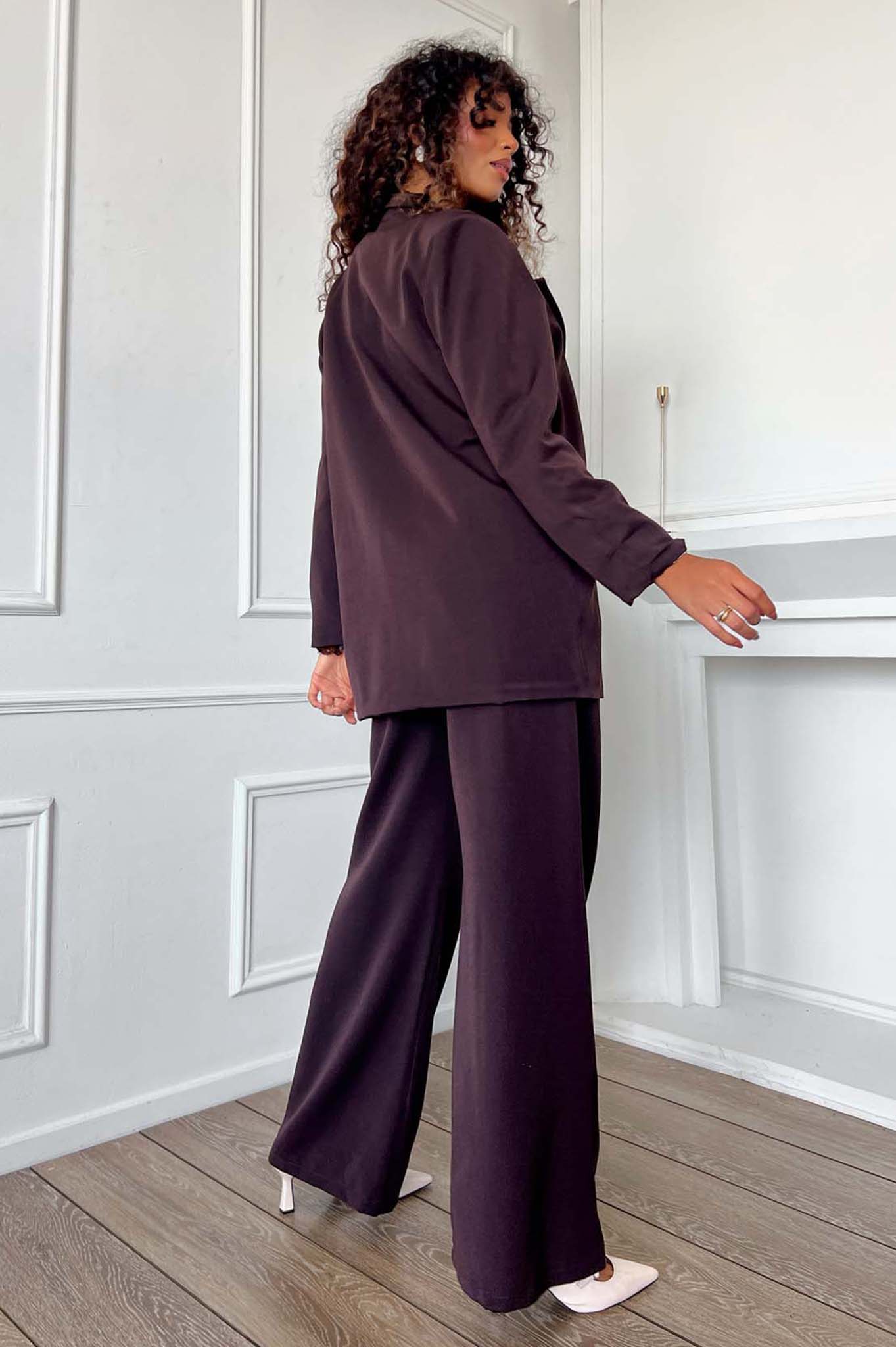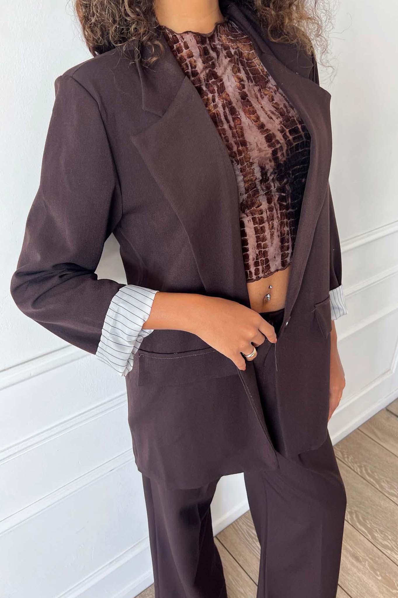 Σετ σακάκι παντελόνι με ριγέ τελείωμα στα μανίκια. Σακάκι: μήκος 77cm, στήθος 110cm, μανίκι 60cm. Παντελόνι: μήκος 105cm, μέση 70cm.
