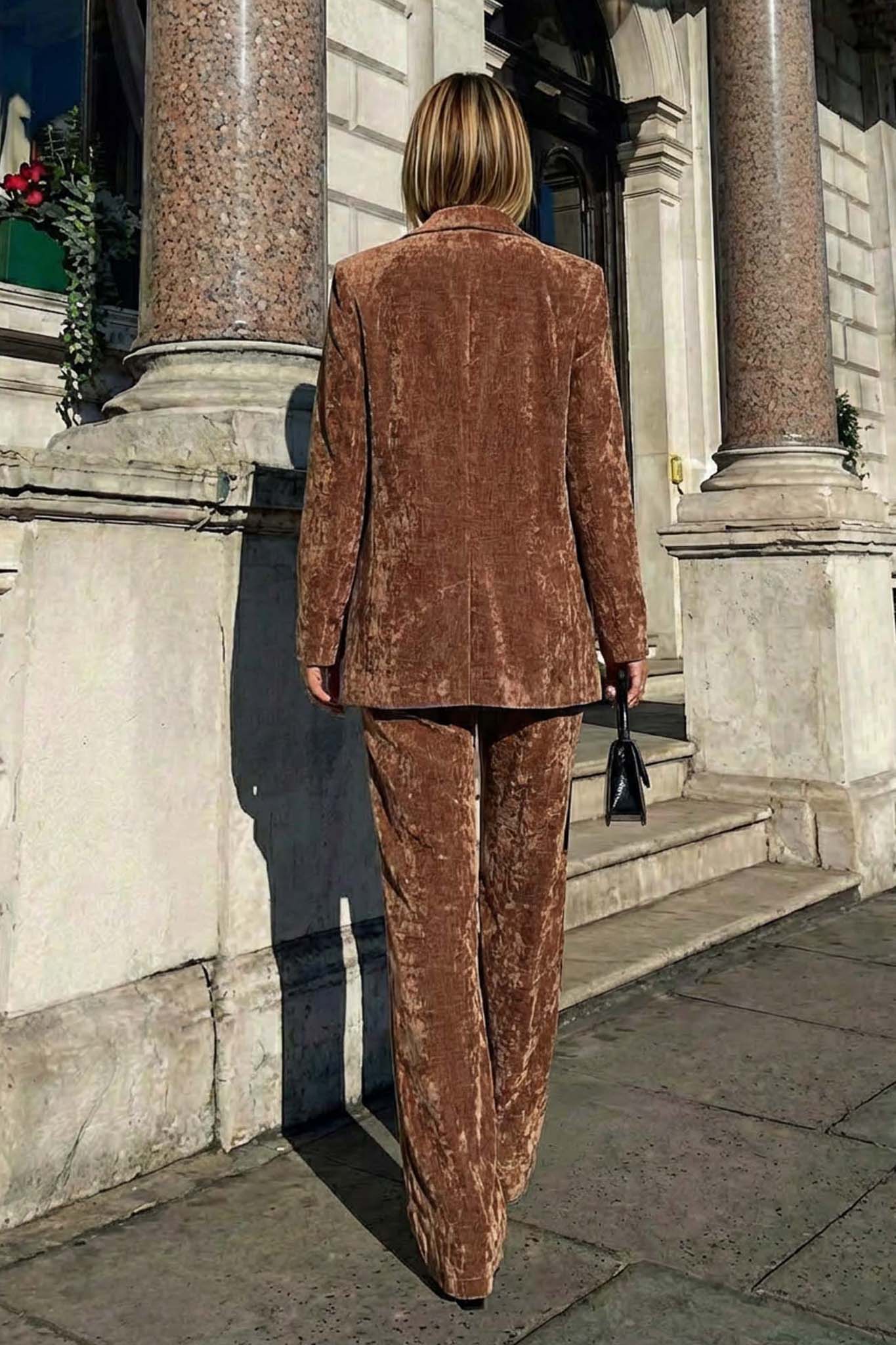 Σετ που αποτελείται από σακάκι και παντελόνι. Σε βελούδινη ύφανση. Oversized εφαρμογή στο σακάκι με βάτες & κανονική στο παντελόνι. Προσφέρει ένα luxury αποτέλεσμα. Ιδανική επιλογή για: γιορτινές επίσημες περιστάσεις, night out, προσεγμένες εμφανίσεις. Συνδιασμός με μπότα ή τακούνι.