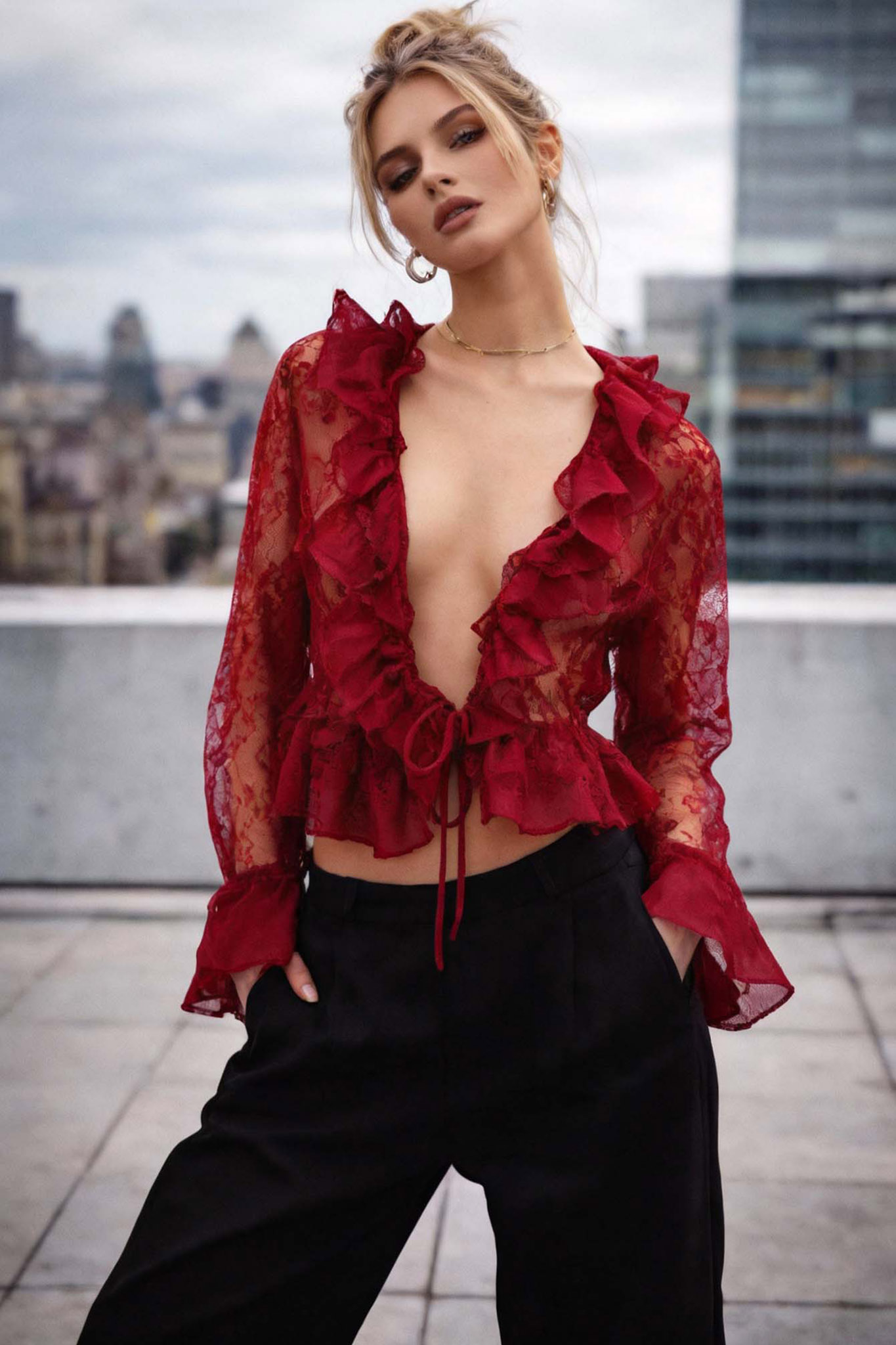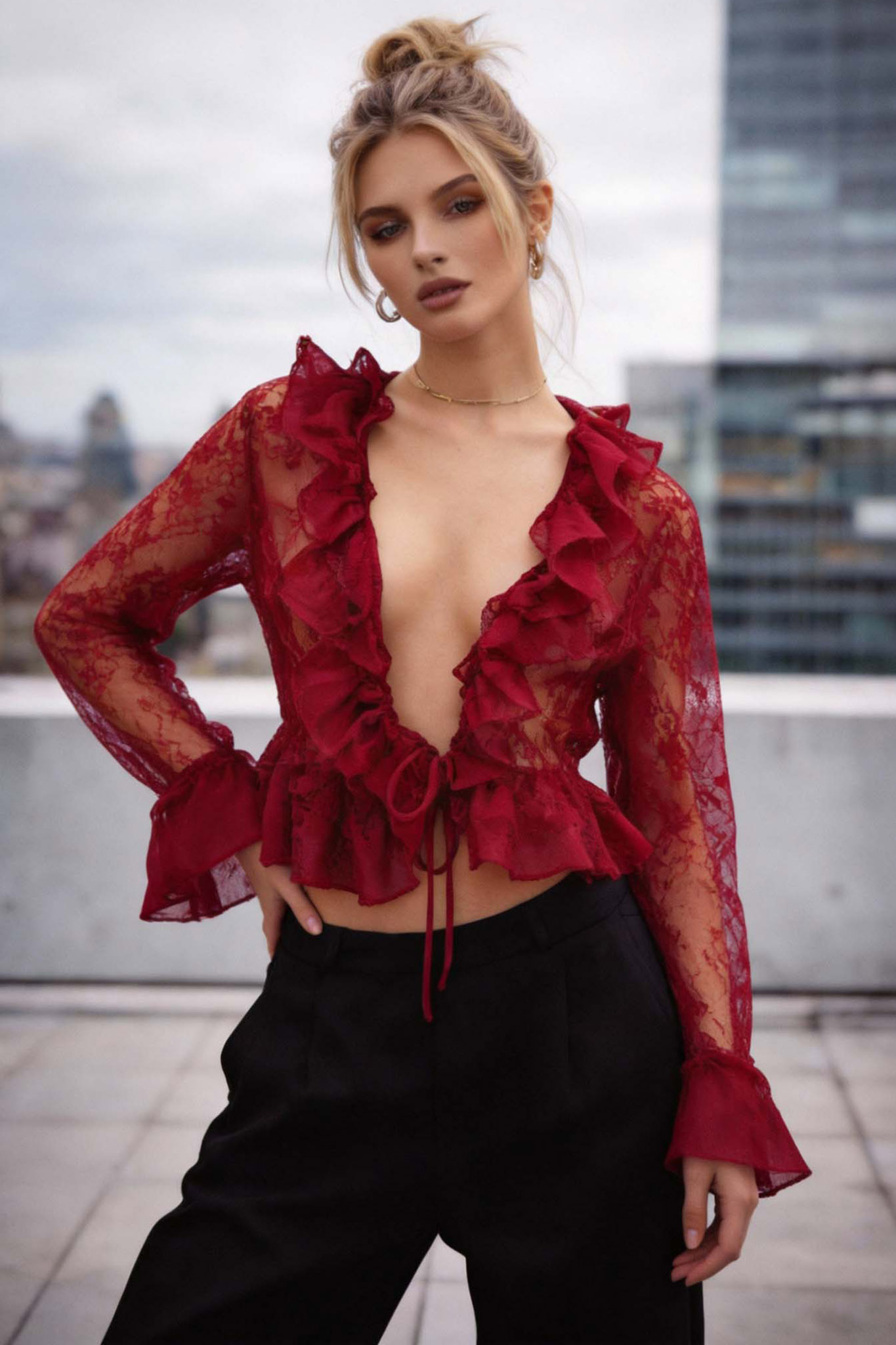 Αναδείξτε το ρομαντικό και ταυτόχρονα αισθησιακό σας στυλ με αυτό το εντυπωσιακό, κοντό (cropped) τοπ από μαύρη δαντέλα. Διαθέτει μια κολακευτική, βαθιά V-λαιμόκοψη με πλούσια βολάν περιμετρικά. Το τοπ κλείνει μπροστά με διακριτικό δέσιμο και έχει μακριά, διάφανα μανίκια με βολάν στα τελειώματα.