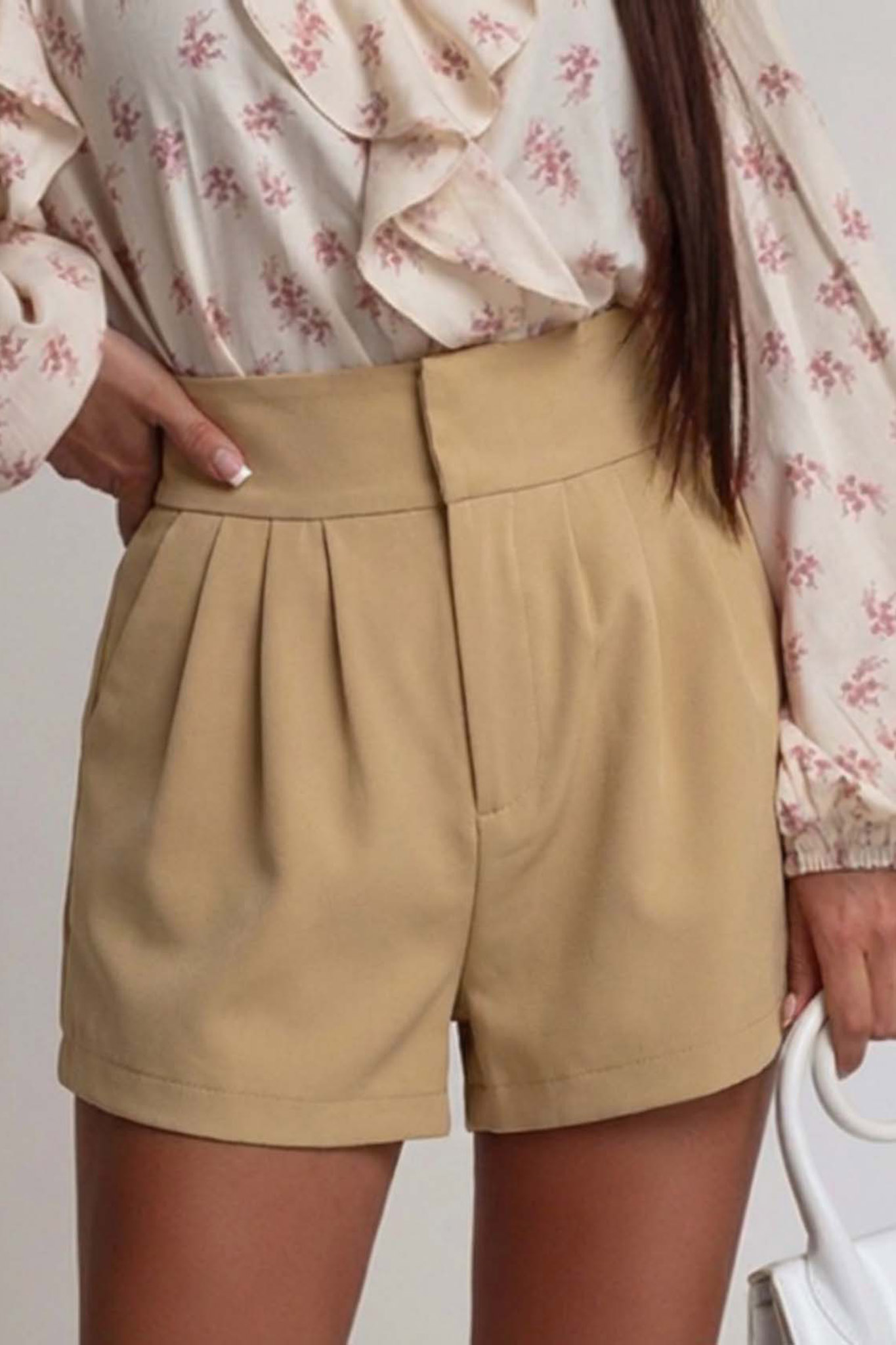 Ψηλόμεσο σορτς με διακριτικές πιέτες και κανονική εφαρμογή. Κατασκευασμένο από ανάλαφρο ύφασμα, προσφέρει άνεση και στυλ, ιδανικό για αέρινες, καλοκαιρινές εμφανίσεις.