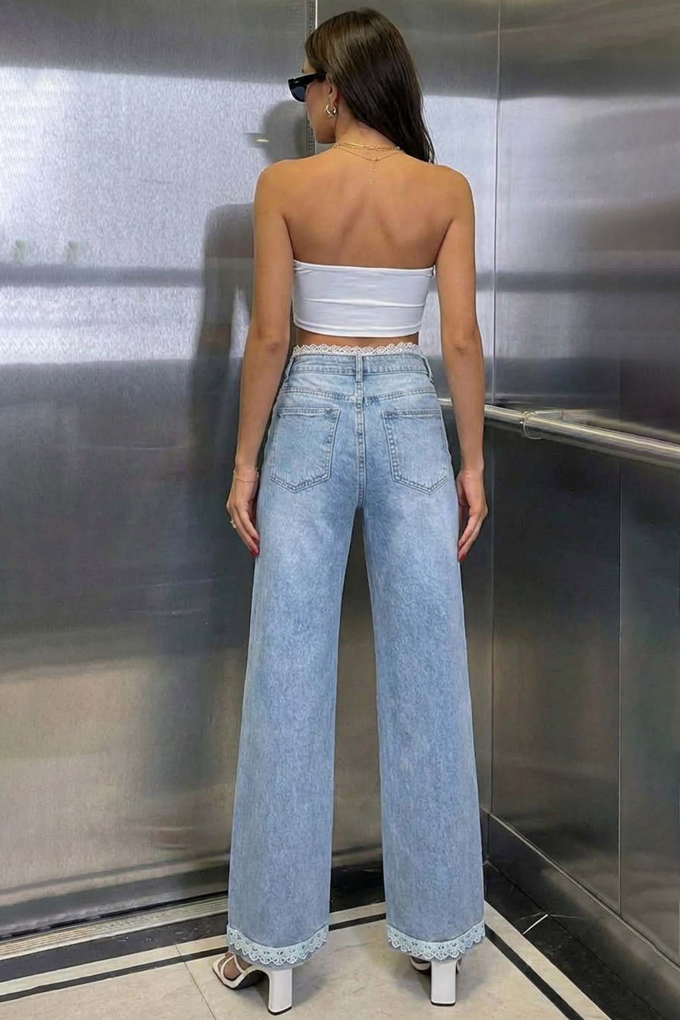 Ψηλόμεσο Τζιν Wide-Leg με Λεπτομέρειες Δαντέλας. Κάντε μια μοναδική στυλιστική δήλωση με αυτό το εντυπωσιακό wide-leg τζιν σε ανοιχτή μπλε απόχρωση. Το χαρακτηριστικό που το απογειώνει είναι η διακοσμητική δαντέλα στη μέση και στο τελείωμα των μπατζακιών, προσφέροντας μια ρομαντική και απόλυτα θηλυκή πινελιά στο κλασικό denim.