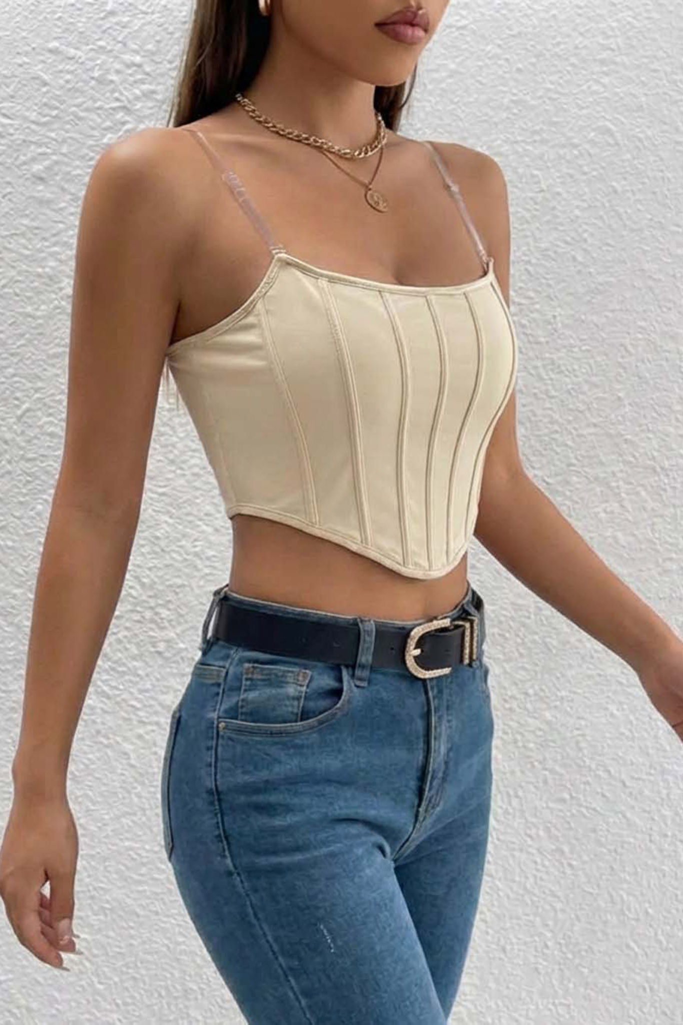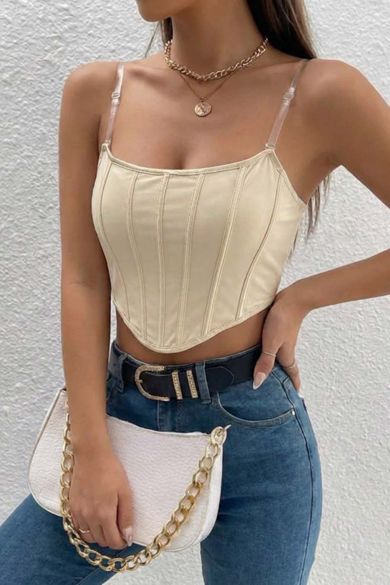 Crop top σε στυλ κορσέ, σχεδιασμένο για να σμιλεύει και να κολακεύει τη σιλουέτα. Διαθέτει κάθετες μπανέλες που προσφέρουν δομή και σταθερότητα, ενώ το τριγωνικό τελείωμα στο κάτω μέρος χαρίζει μια μοντέρνα αίσθηση.