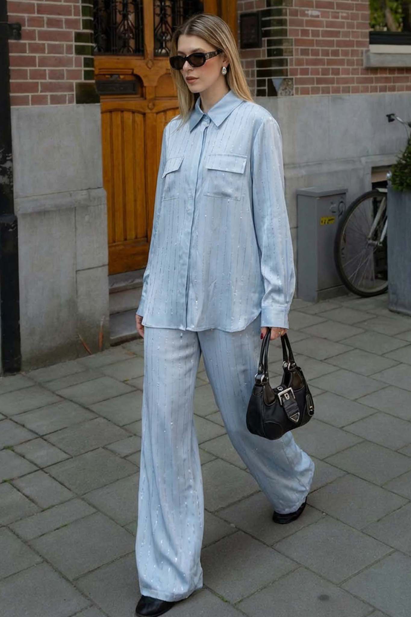 Σετ αποτελείται από ένα μακρυμάνικο πουκάμισο και παντελόνι με φαρδιά γραμμή, ιδανικό για μια ολοκληρωμένη εμφάνιση που συνδυάζει άνεση και στυλ. Κατασκευασμένο από ύφασμα που μοιάζει με μετάξι, σε απαλό γαλάζιο χρώμα με διακριτικές κάθετες ρίγες με ατρας, προσφέρει μια αέρινη και πολυτελή αίσθηση.