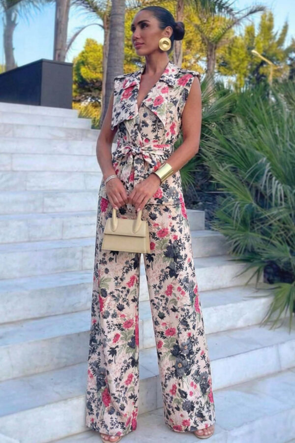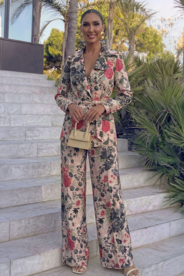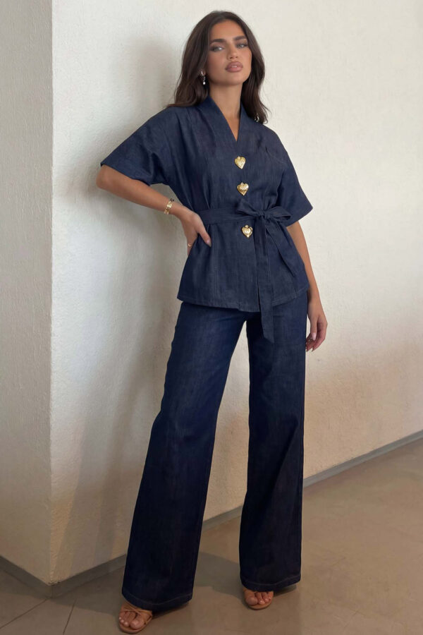 Σετ που αποτελείται από τζάκετ και παντελόνι. Σε τζιν ύφανση με στρας σε όλη την επιφάνεια. Παντελόνι με ρεβερ στο τελείωμα, εφαρμοστό στο πάνω μέρος και άνοιγμα στο τελείωμα, αναδεικνύοντας έτσι την σιλουέτα. Το τζακετ έχει κανονική γραμμή. Προσφέρουν μαζί ένα glam αποτέλεσμα. Ιδανικό σετ για καθημερινές πιο λαμπερές και γιορτινές εμφανίσεις.