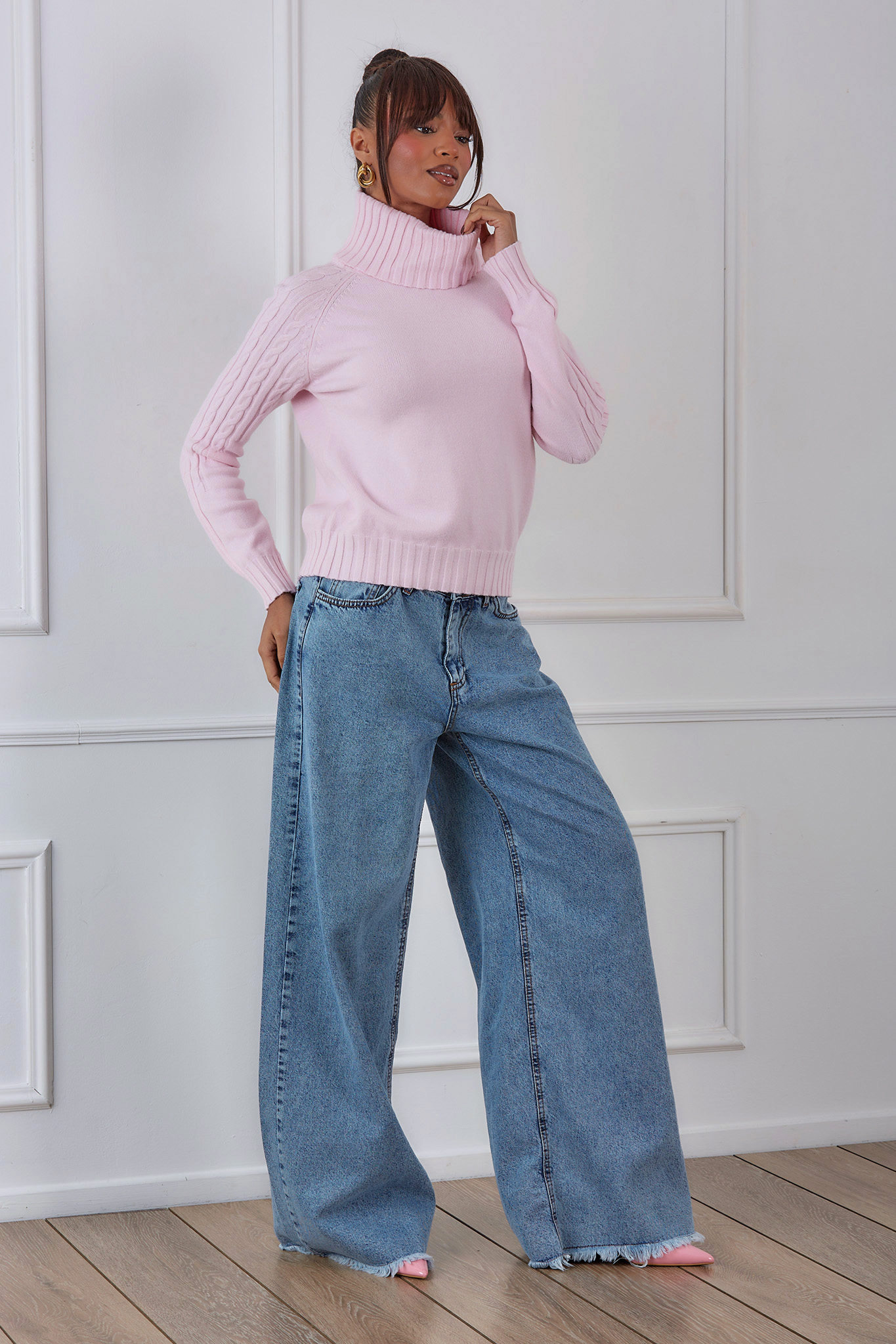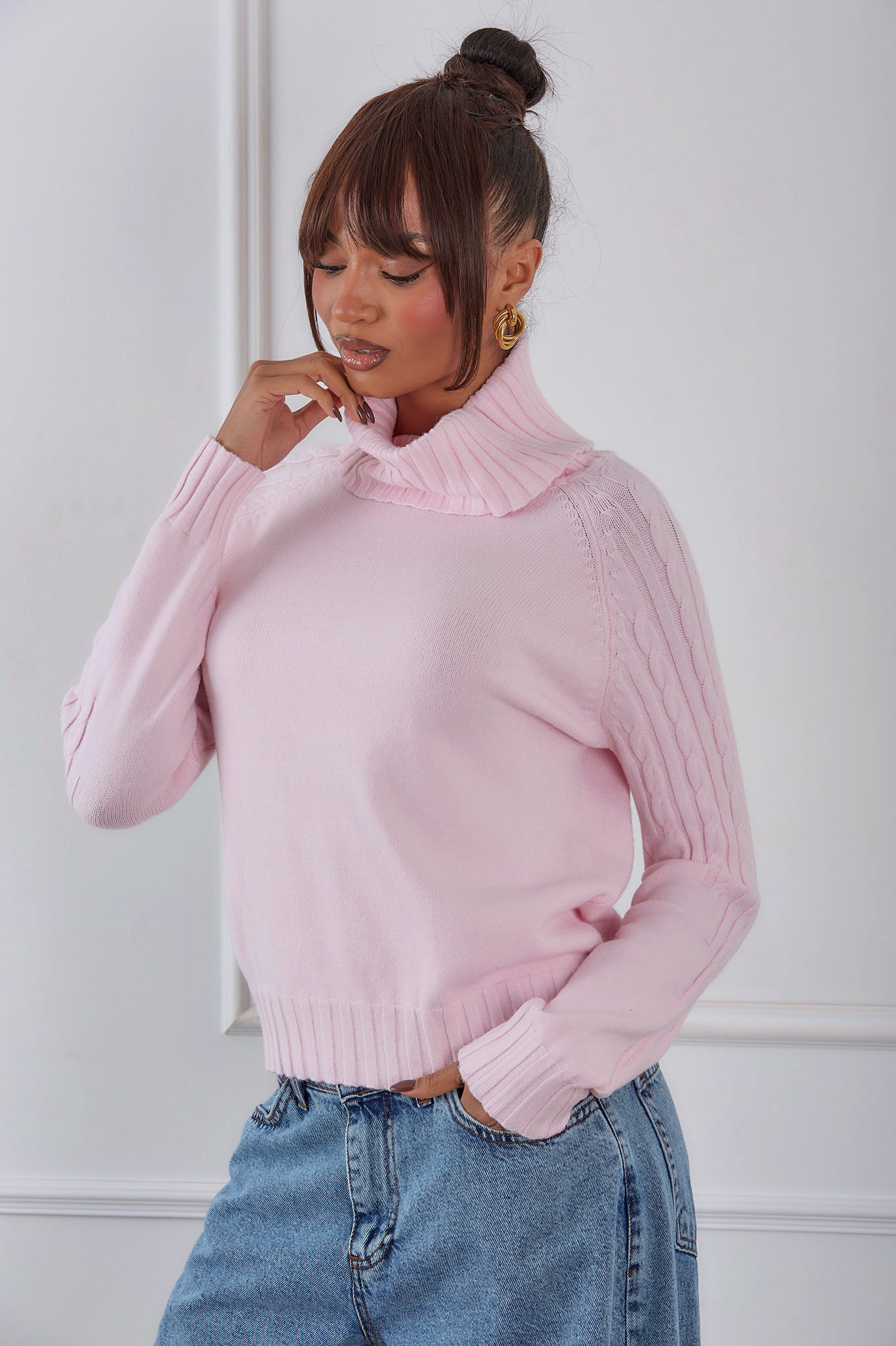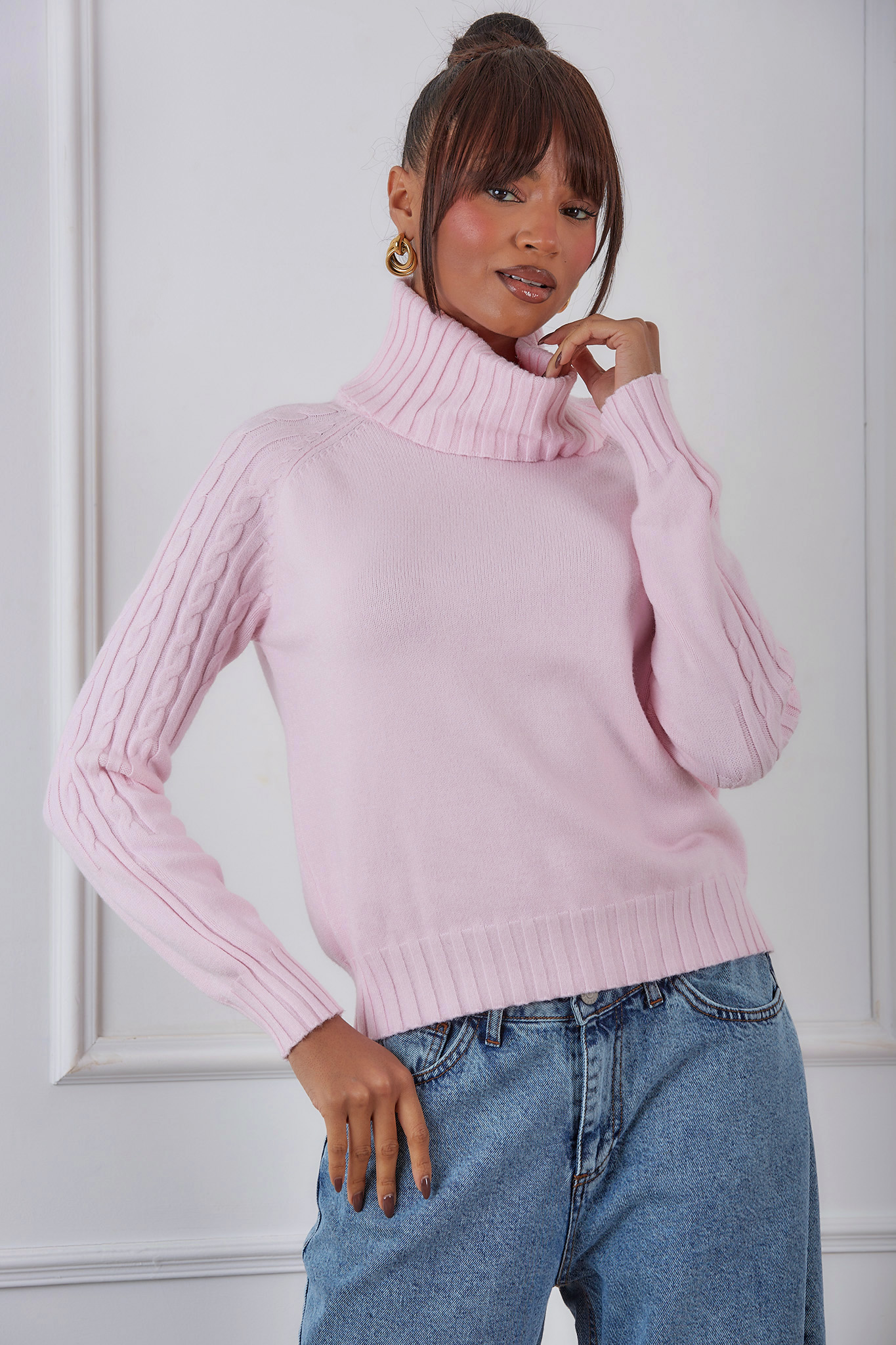 Ζεστό και κομψό πλεκτό πουλόβερ με ψηλό ζιβάγκο, ιδανικό για τις κρύες μέρες του χειμώνα. Διαθέτει μακριά μανίκια με διακριτικό πλεκτό σχέδιο στα πλαϊνά και ελαστικό τελείωμα στη μέση και στα μανίκια για άνετη εφαρμογή. Κατασκευασμένο από μαλακό, ποιοτικό ύφασμα που προσφέρει άνεση και στυλ όλη μέρα. Μήκος 52cm, στήθος 55cm, μανίκι 58cm.