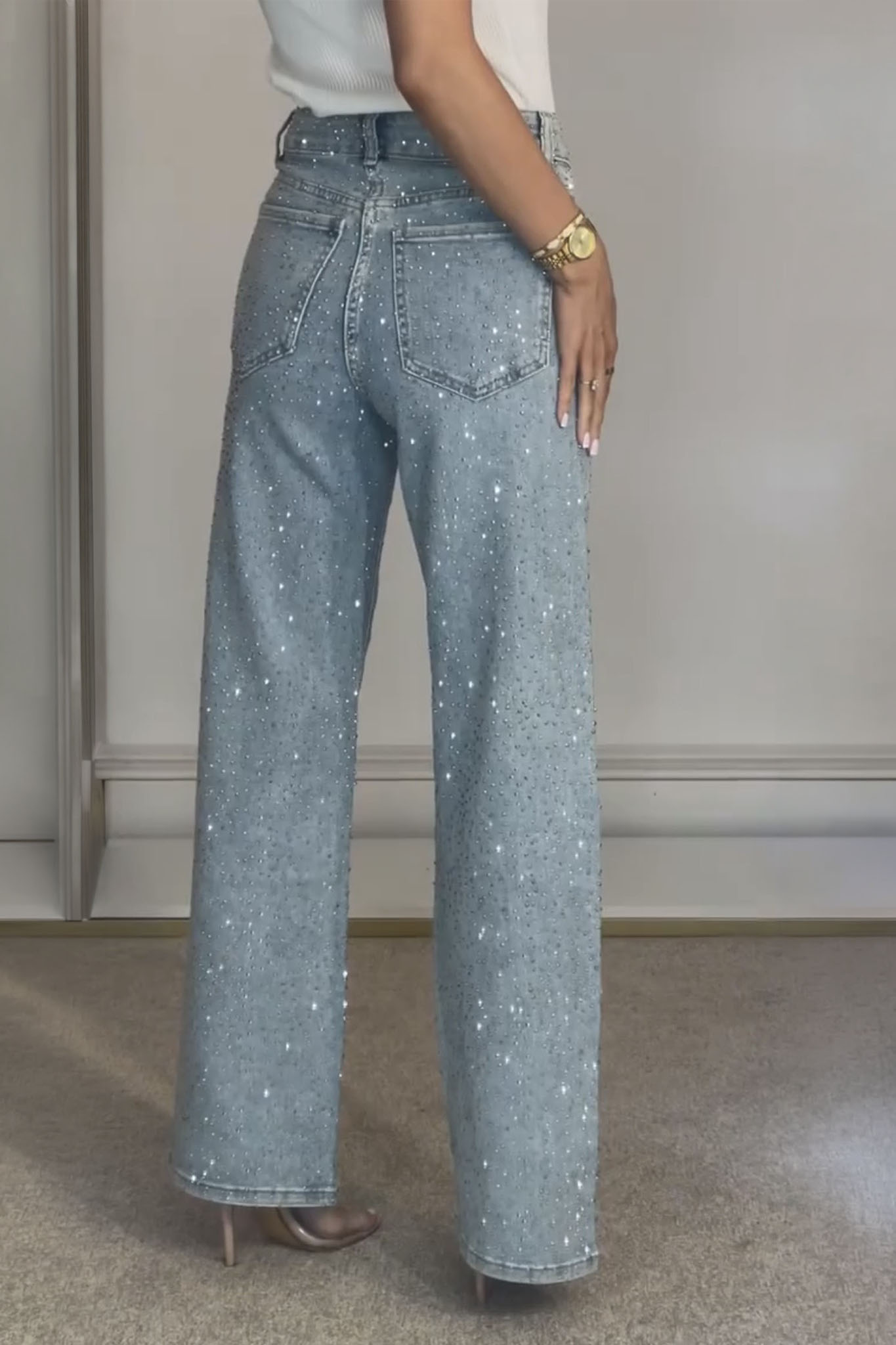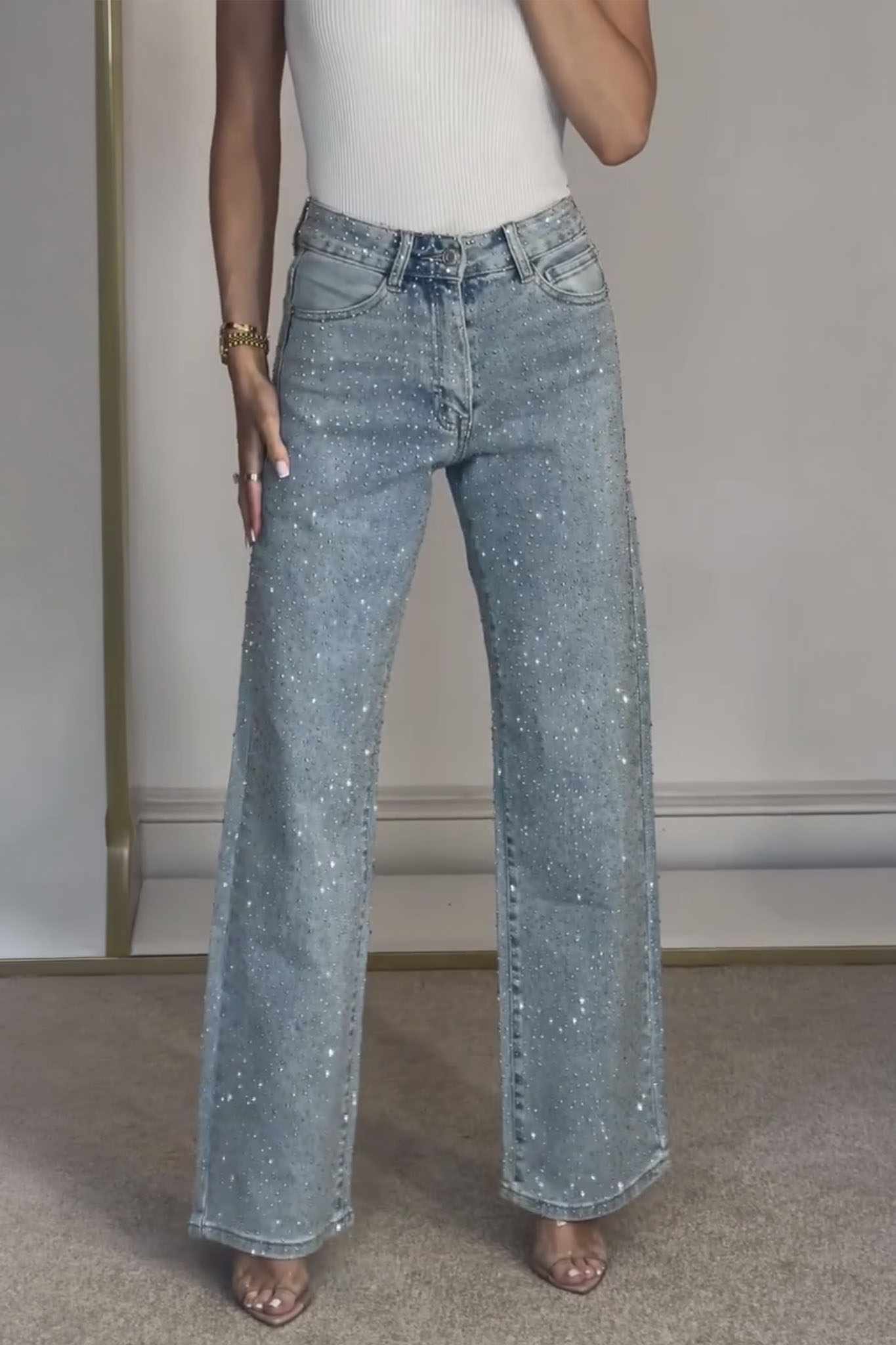 Αυτό το ψηλόμεσο τζιν σε φαρδιά, ίσια γραμμή, διακοσμημένο με αστραφτερά στρας, διαθέτει κλασικές τσέπες και κλείσιμο με φερμουάρ και κουμπί. Ιδανικό για βραδινές εξόδους.