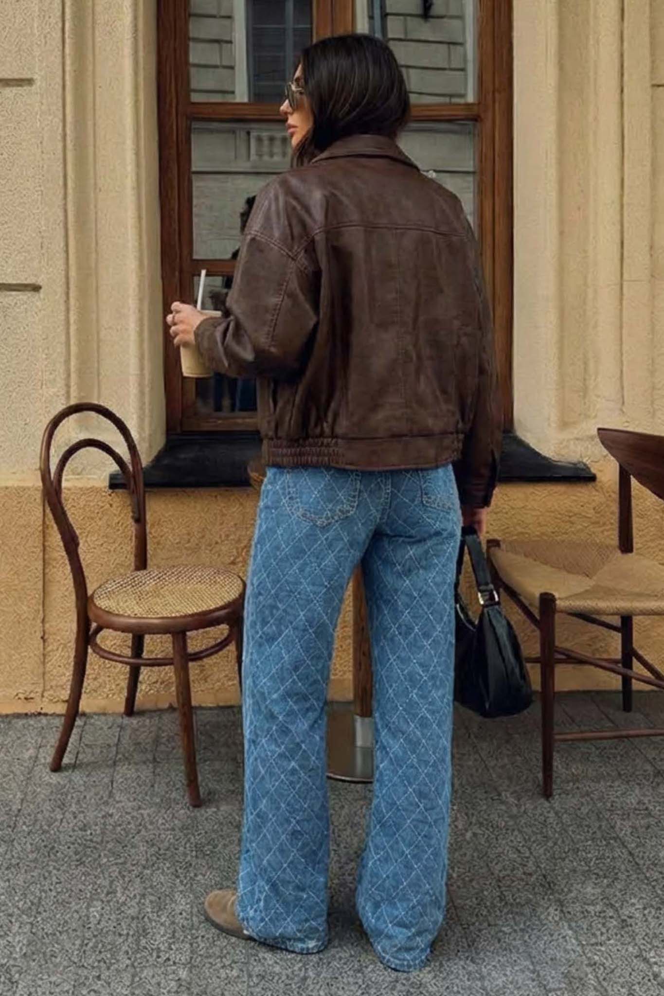 Τζιν με ψηλή μέση, φαρδιά και ίσια γραμμή και λευκά σχέδια που μοιάζουν με ρόμβους. Διαθέτει κλείσιμο με φερμουάρ και κουμπί, και σχέδιο πέντε τσεπών.
