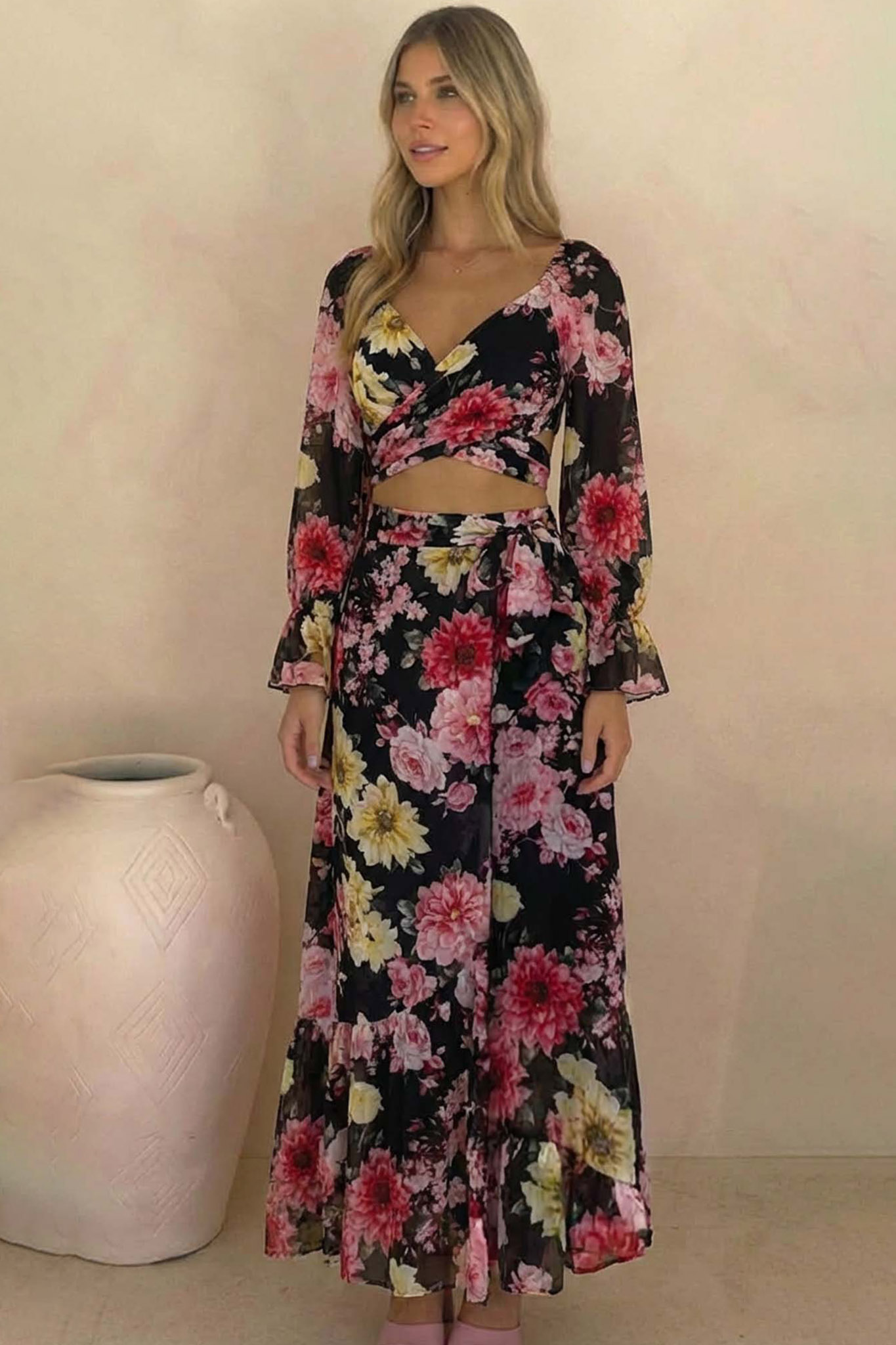 Φλοράλ σετ που αποπνέει μια ρομαντική και απόλυτα καλοκαιρινή αύρα, ιδανική για επίσημες ή casual chic εμφανίσεις. Αποτελείται από ένα κρουαζέ crop top με θηλυκή λαιμόκοψη και μακριά μανίκια με βολάν, που συνδυάζεται άψογα με μια maxi ψηλόμεση φούστα με ανάλαφρη κίνηση.