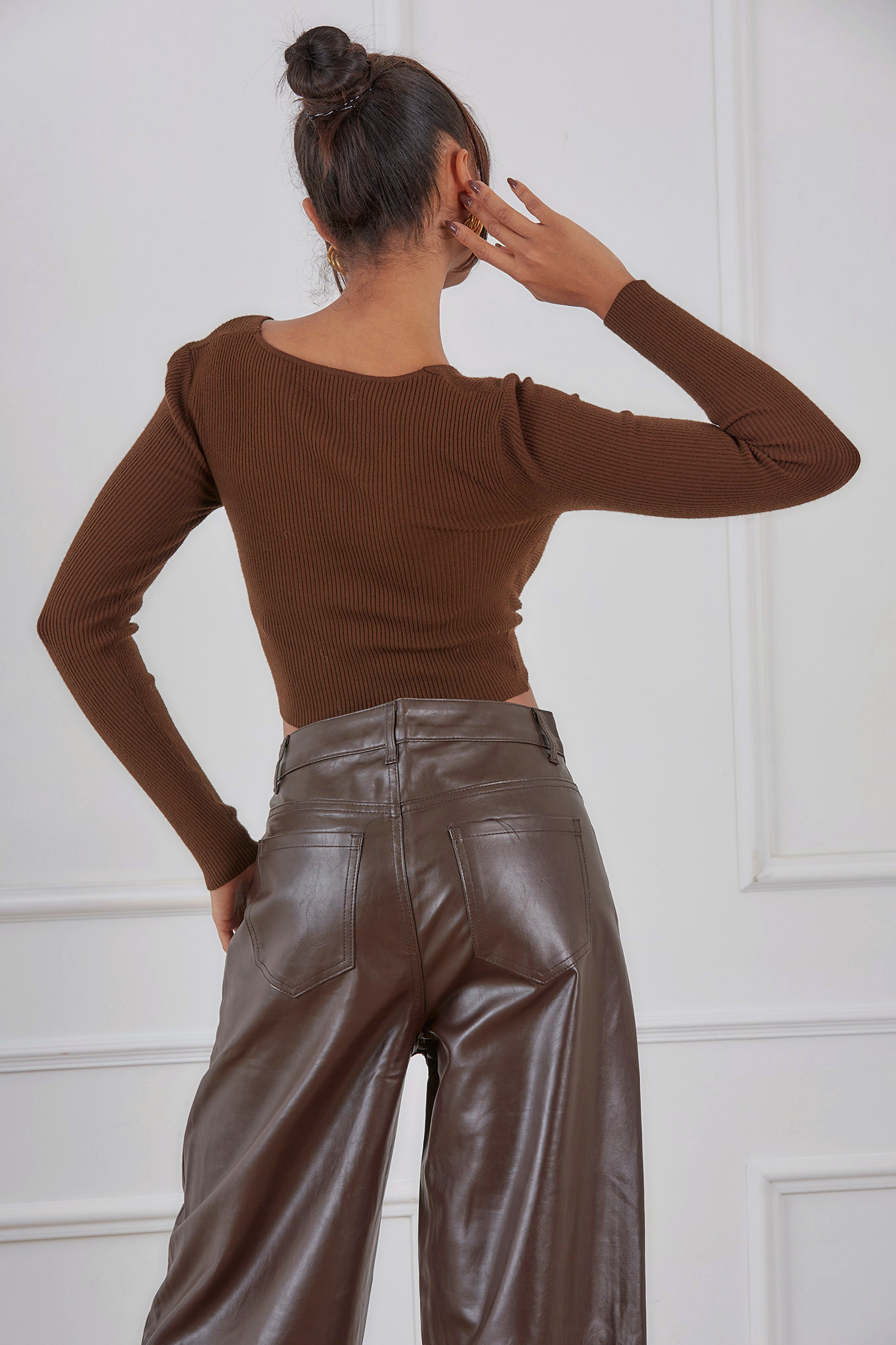 Tacosπλεκτό μακρυμάνικο τοπ με λεπτομέρεια κόμπου καφέ