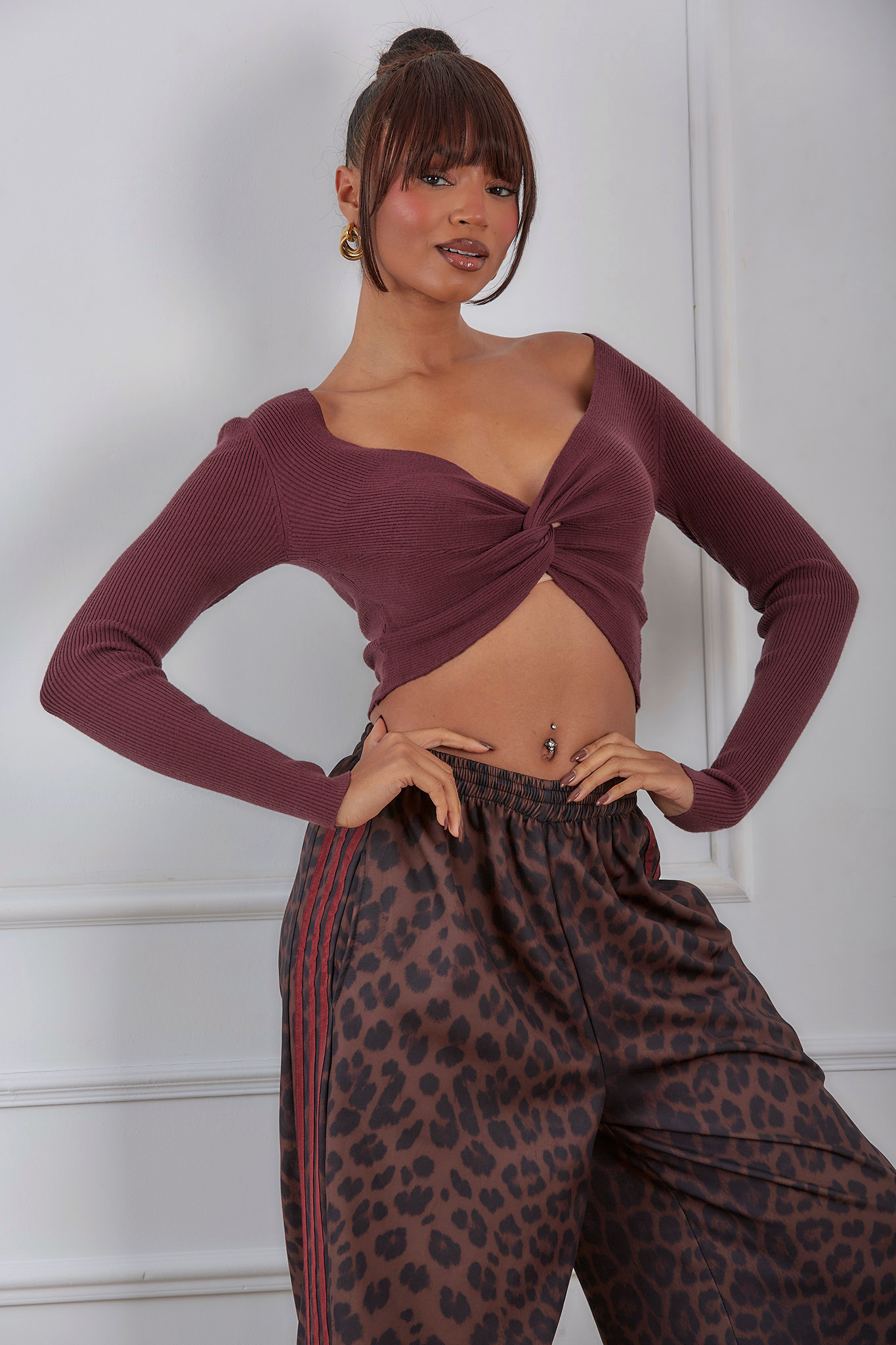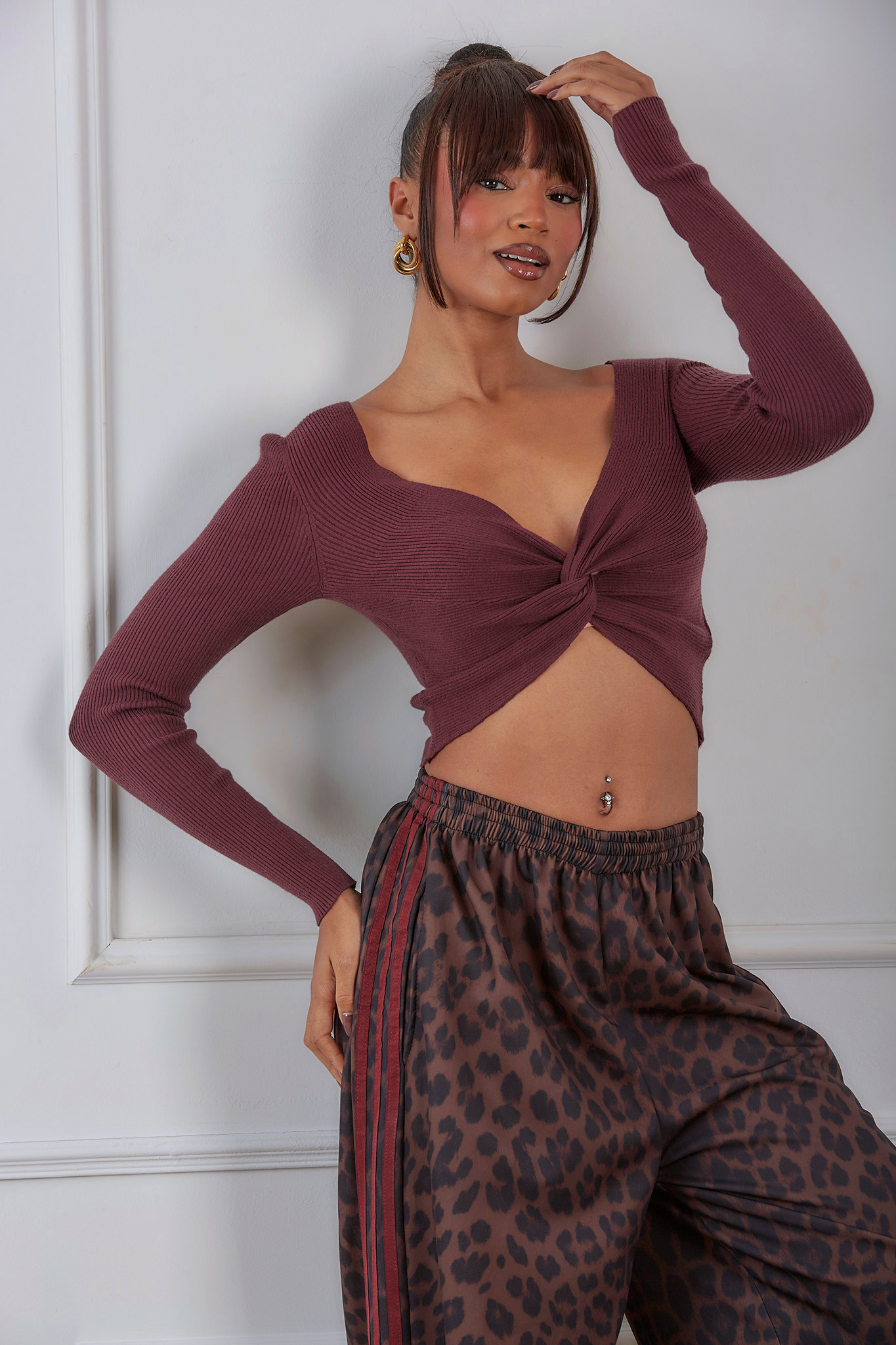 Tacosπλεκτό μακρυμάνικο τοπ με λεπτομέρεια κόμπου μπορντό