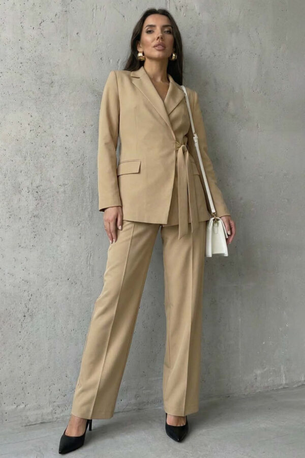 Blazer με Δέσιμο & Παντελόνι σε Ίσια Γραμμή. Ένα ιδιαίτερο σακάκι με κλείσιμο σε στυλ φακέλου. Διαθέτει ενσωματωμένη ζώνη που δένει στη μέση, αναδεικνύοντας τη σιλουέτα, και κλασικό πέτο για σοφιστικέ ύφος. Οι διακριτικές τσέπες με καπάκι προσθέτουν μια tailored πινελιά.