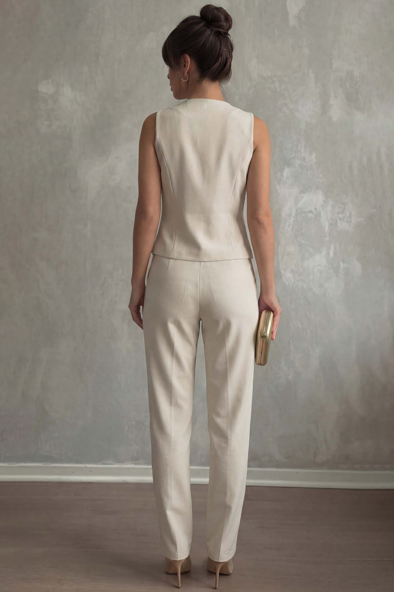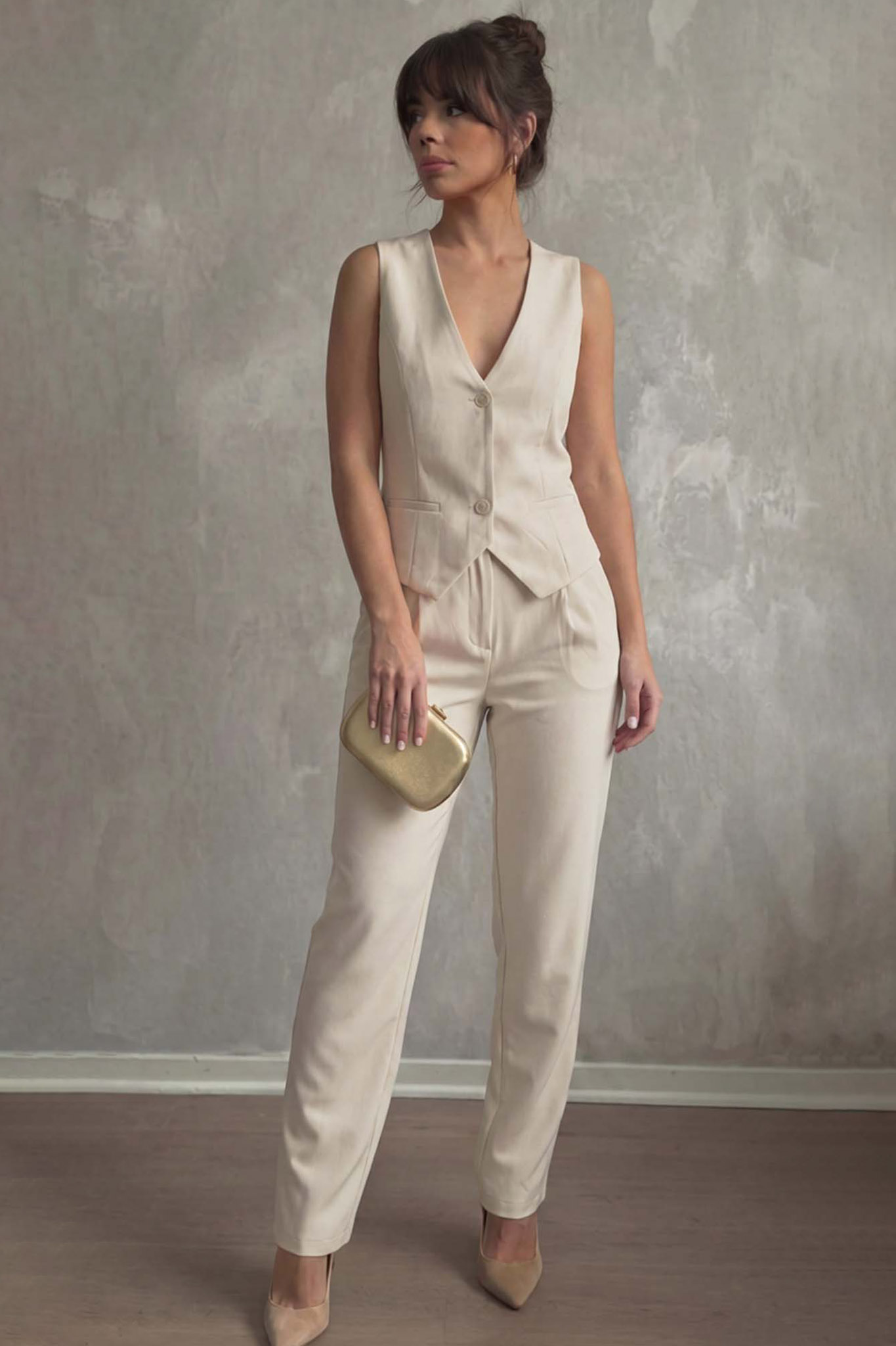 Σετ κοστουμιού αποτελείται από ένα αμάνικο γιλέκο με βαθύ ντεκολτέ, κλείσιμο με κουμπιά στο μπροστινό μέρος και δύο διακριτικές τσέπες. Το κάτω μέρος περιλαμβάνει ένα παντελόνι σε ίσια γραμμή με λάστιχο στη μέση για άνετη εφαρμογή, δημιουργώντας μια ολοκληρωμένη και προσεγμένη εμφάνιση.