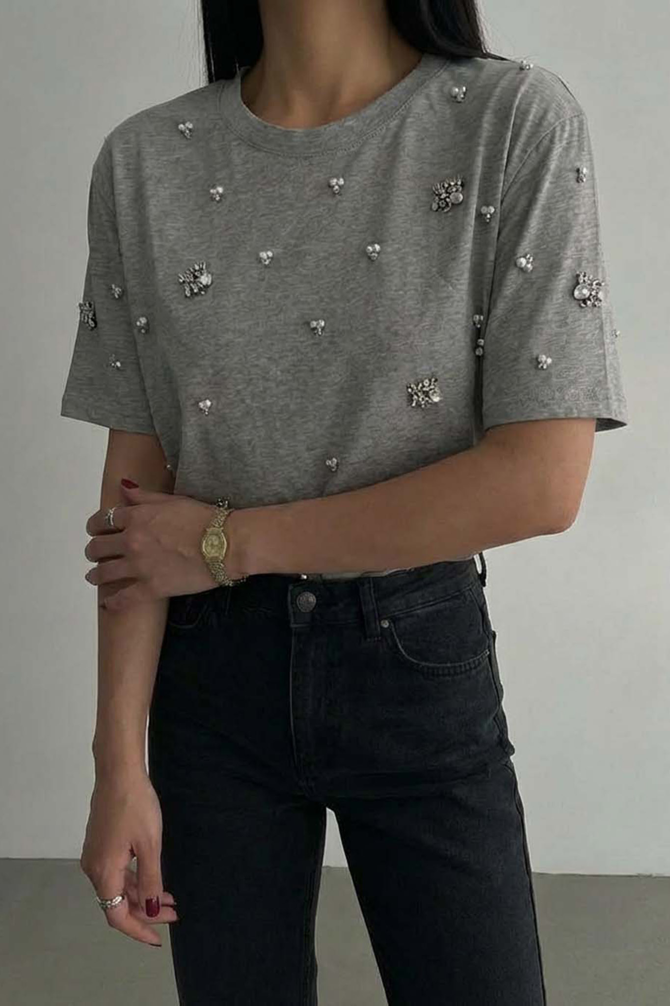 Tamanat-shirt με πέρλες και πέτρες γκρι