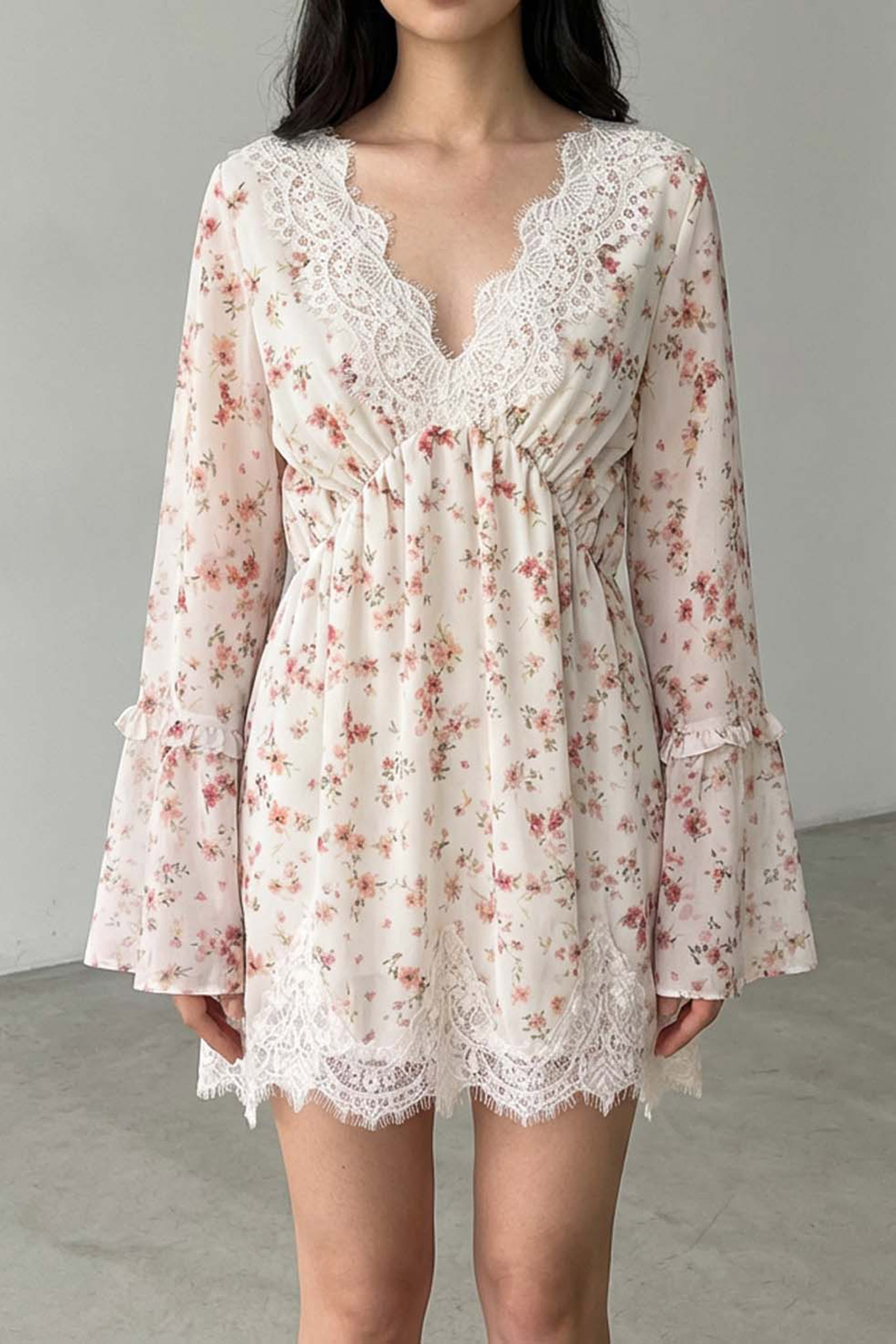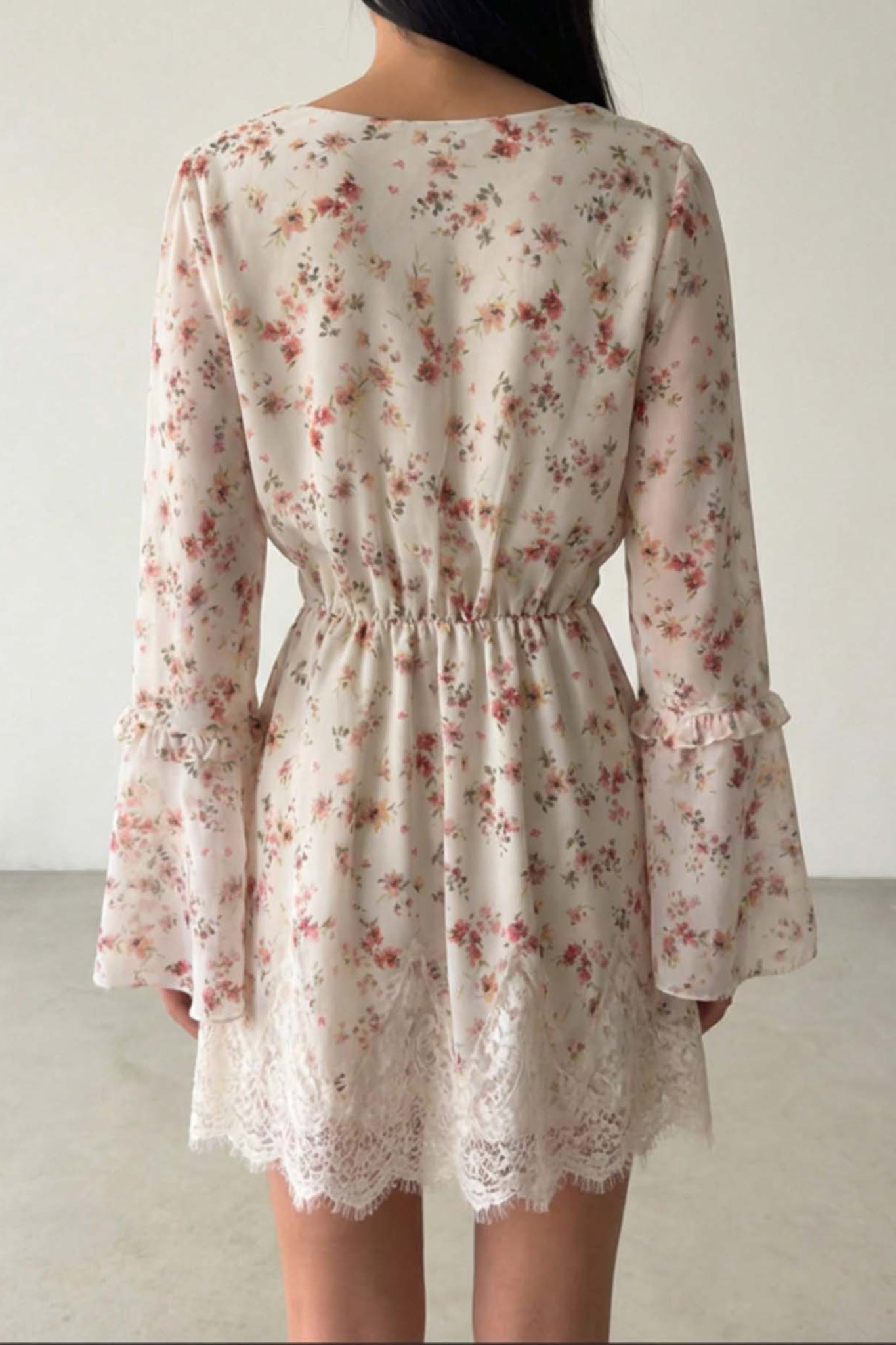 Μίνι φόρεμα φλοράλ με λάστιχο στη μέση για πιο άνετη εφαρμογή και δαντέλα στο τελέιωμα. Μήκος: 86cm, στήθος 100cm, μανικι 74cm,