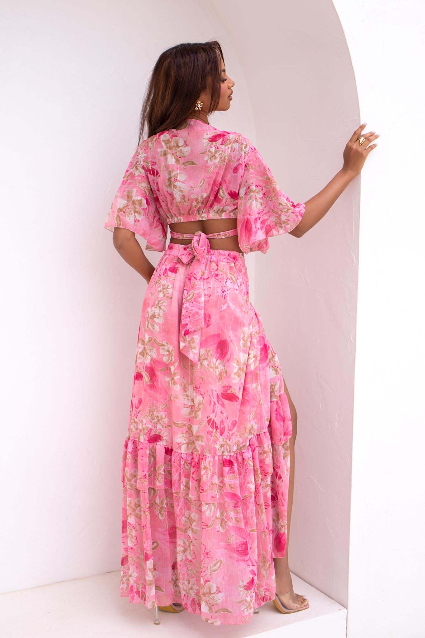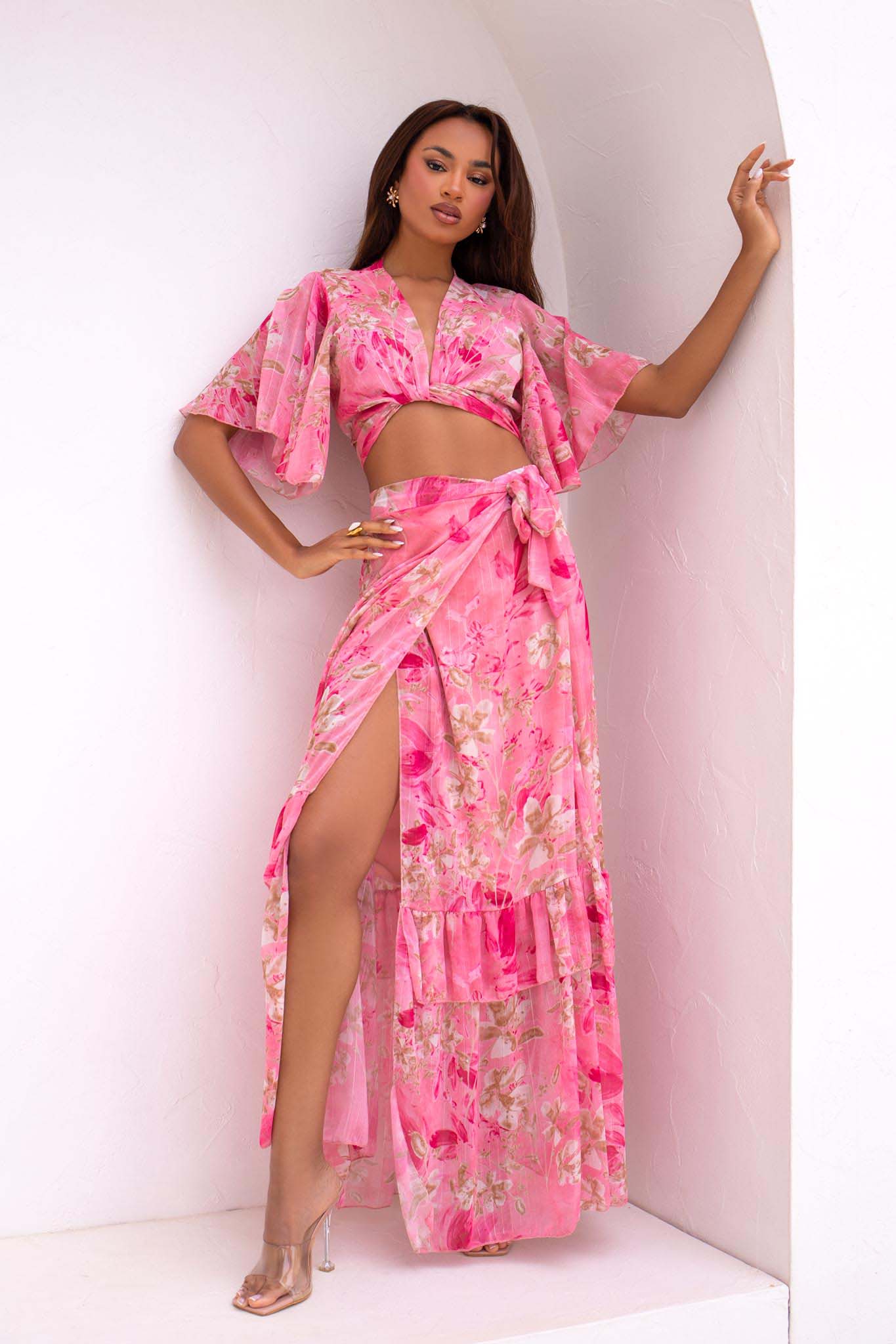 Σετ που αποτελείται από ένα κοντό τοπ με δέσιμο και μια maxi φούστα με βολάν, τα οποία είναι κατασκευασμένα από ελαφρύ φλοράλ ύφασμα και διαθέτουν μανίκια σε στυλ καμπάνα. Το σύνολο αυτό, προσφέρει μια αέρινη και θηλυκή σιλουέτα.