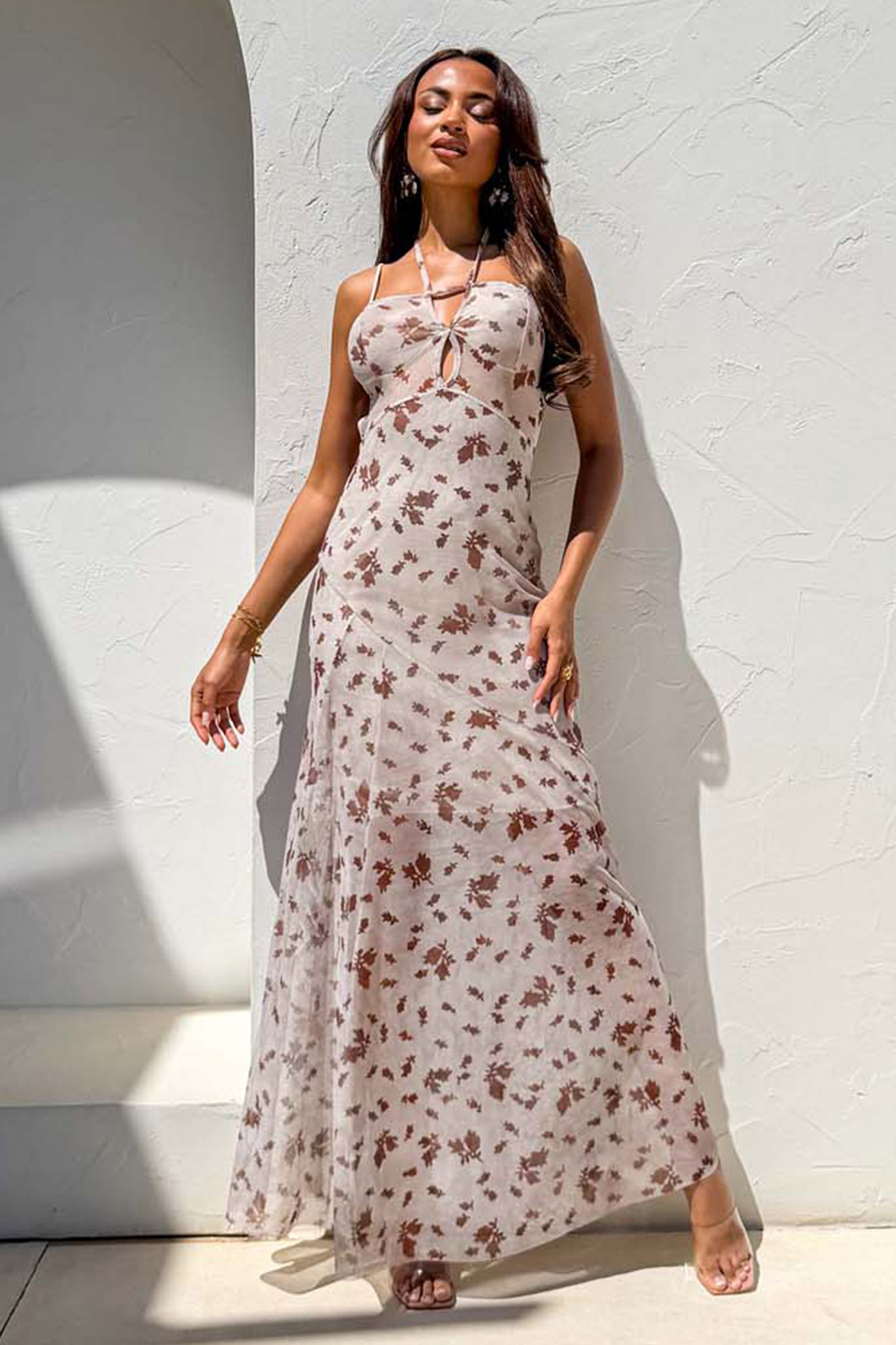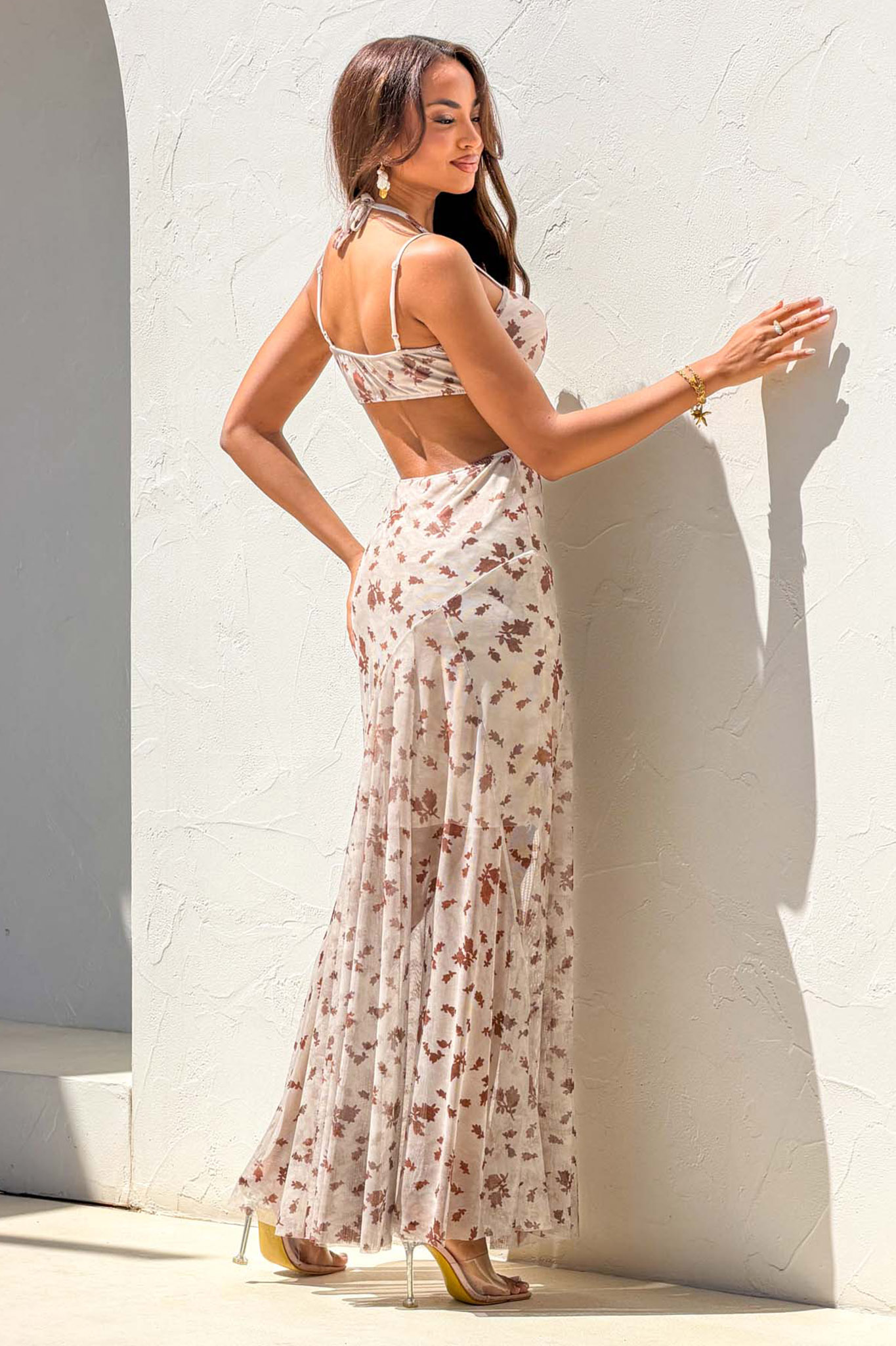 Αέρινο maxi φόρεμα διαθέτει λεπτές τιράντες και ενσωματωμένα cups στο στήθος, ενώ ξεχωρίζει για τις ημιδιάφανες λεπτομέρειες με τούλι στην περιοχή της μέσης που δημιουργούν εφέ κορσέ, συνδυάζοντας το θηλυκό φλοράλ μοτίβο με μια κομψή και αέρινη γραμμή.