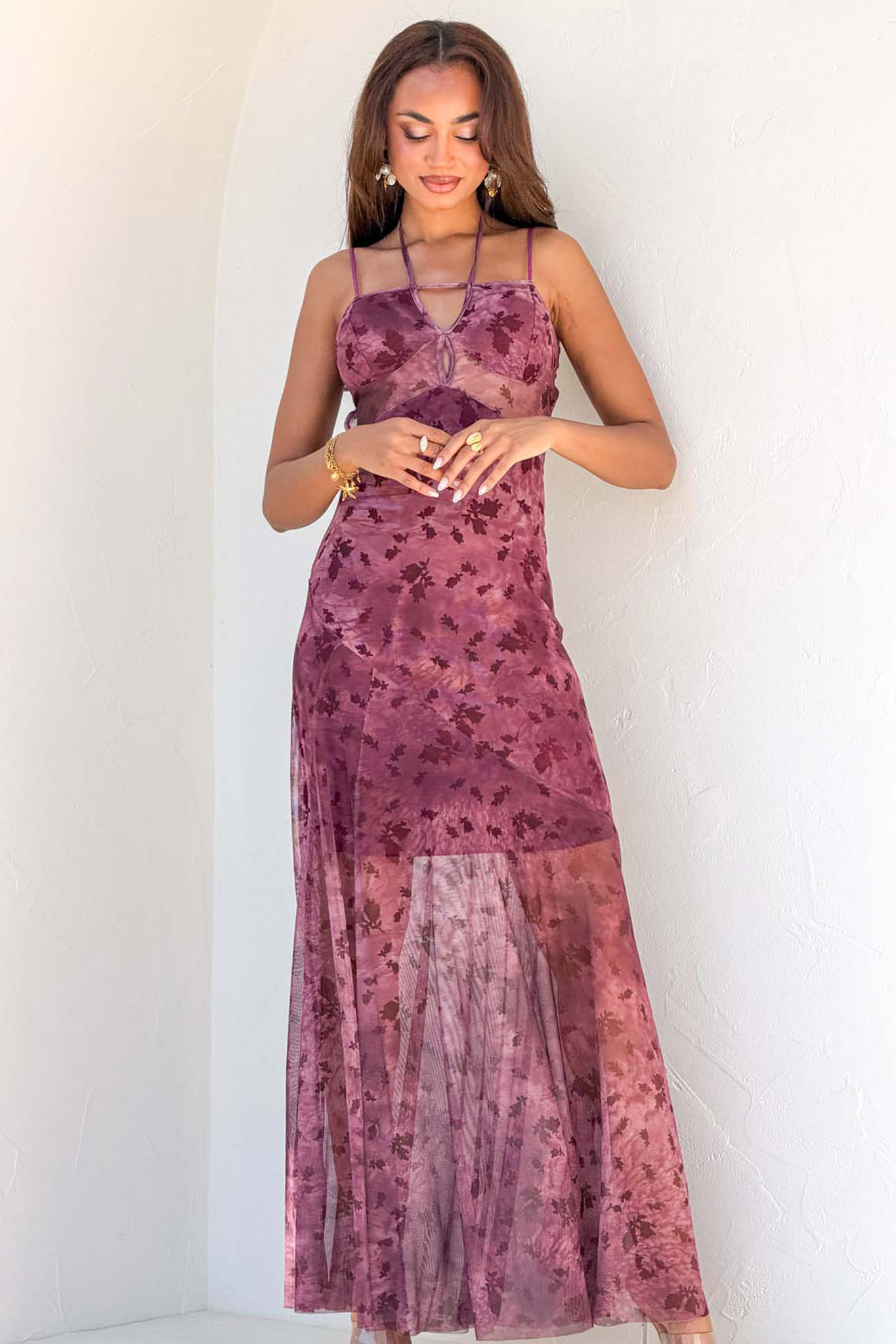 Αέρινο maxi φόρεμα διαθέτει λεπτές τιράντες και ενσωματωμένα cups στο στήθος, ενώ ξεχωρίζει για τις ημιδιάφανες λεπτομέρειες με τούλι στην περιοχή της μέσης που δημιουργούν εφέ κορσέ, συνδυάζοντας το θηλυκό φλοράλ μοτίβο με μια κομψή και αέρινη γραμμή.