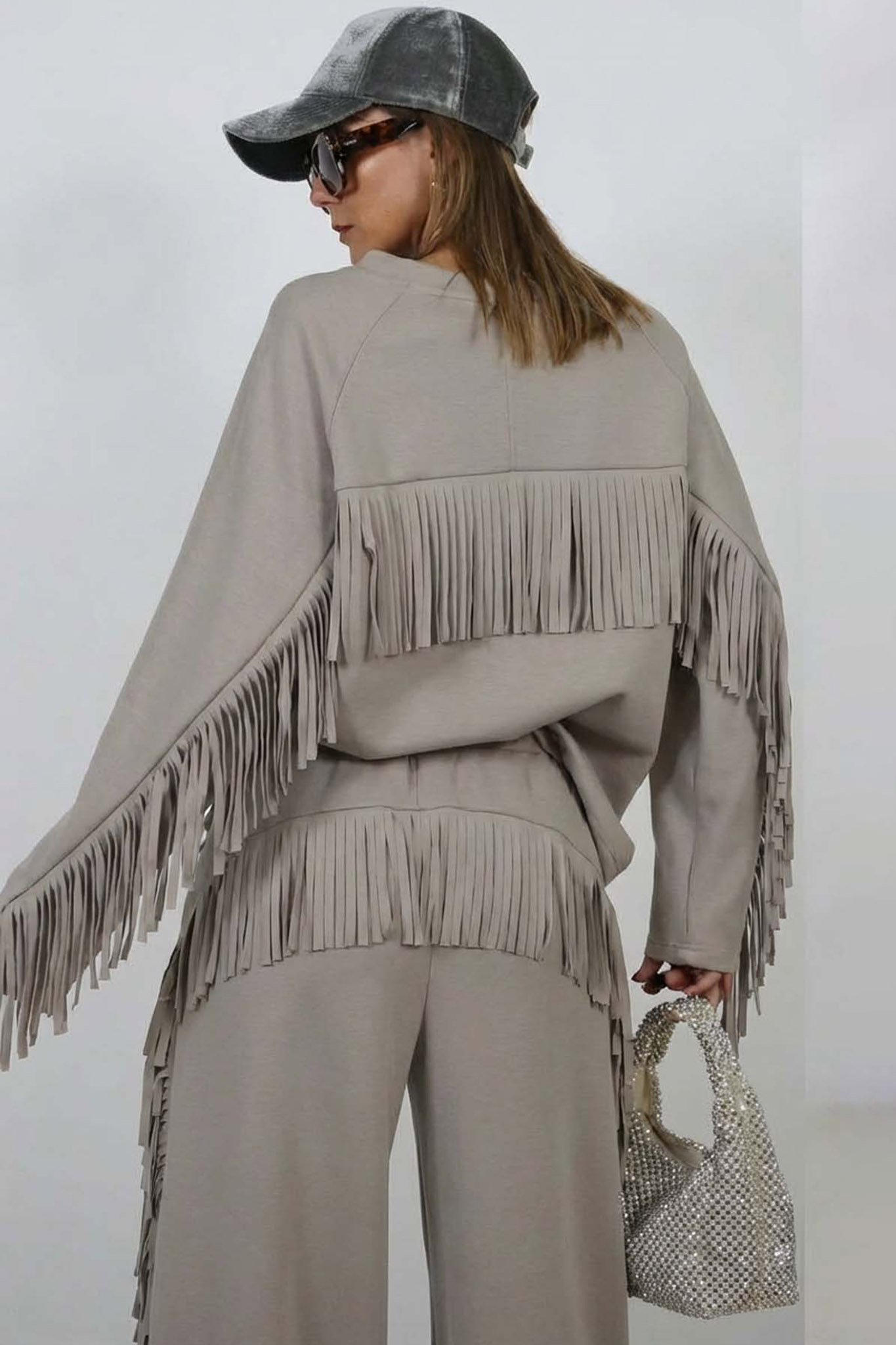 Σετ φόρμα παντελόνι με μπούζα. Δααθέτει κρόσια στα μανίκια και στο παντελόνι που προσδίδει μία ιδιαιτερότητα.