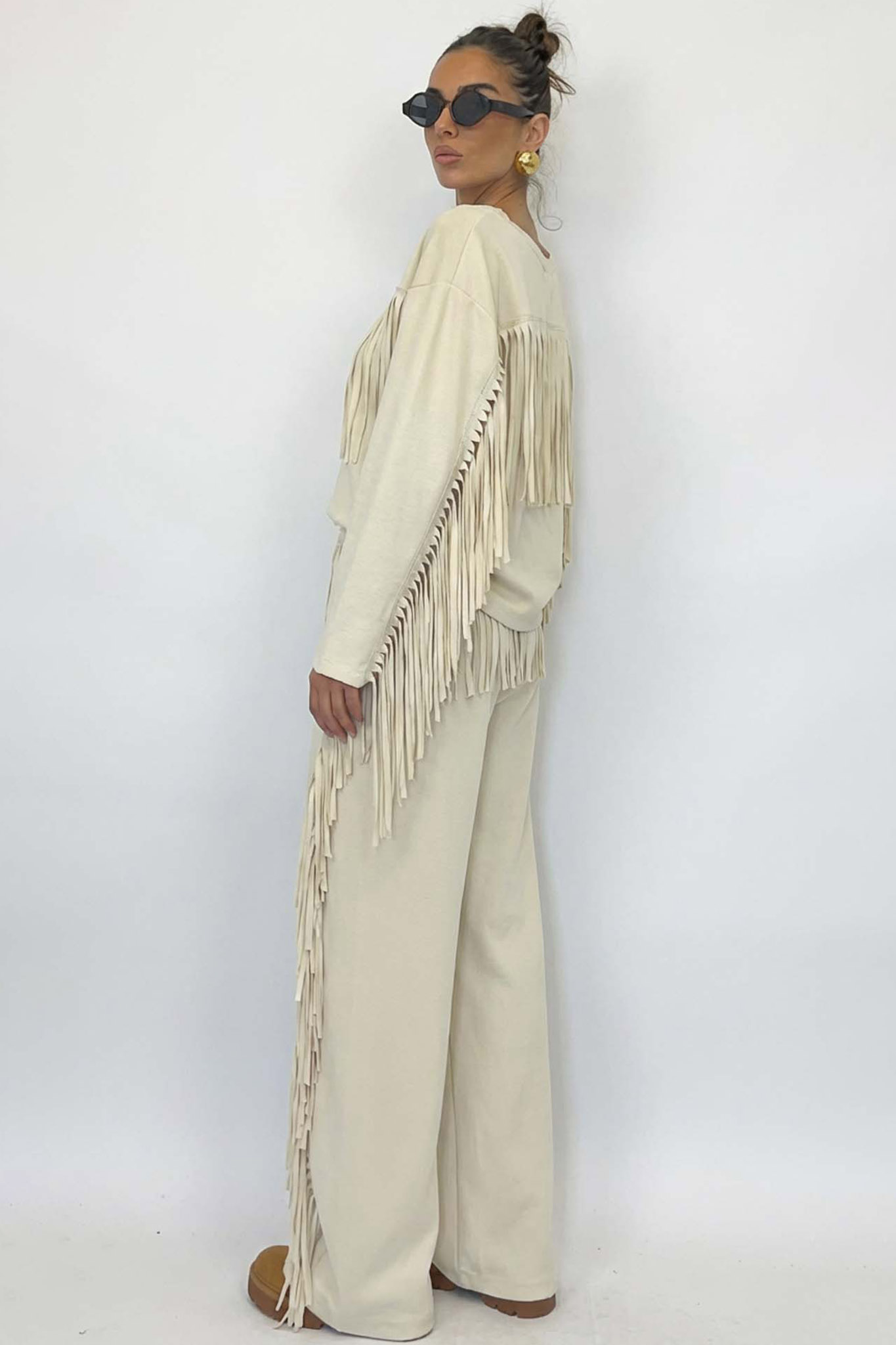 Σετ φόρμα παντελόνι με μπούζα. Δααθέτει κρόσια στα μανίκια και στο παντελόνι που προσδίδει μία ιδιαιτερότητα.