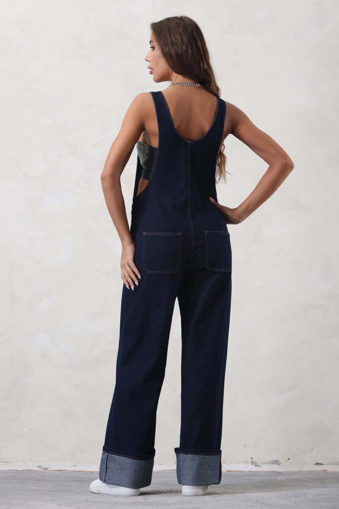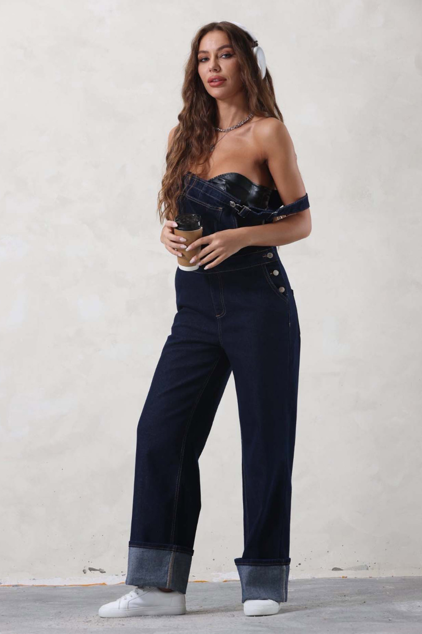 Τζιν σαλοπέτα σχεδιασμένη σε wide-leg (φαρδιά) γραμμή, διαθέτει κλασικές ρυθμιζόμενες τιράντες, πρακτική τσέπη στο στήθος και πλαϊνά κουμπιά που διευκολύνουν την εφαρμογή, ενώ το ρεβέρ στο τελείωμα προσθέτει μια μοντέρνα urban πινελιά.