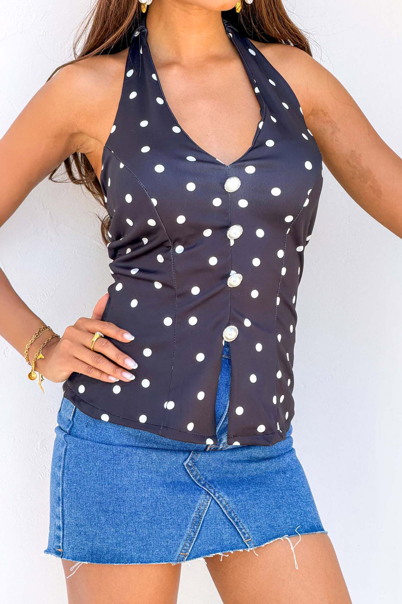 Αυτό το τοπ συνδυάζει τη vintage αισθητική του πουά με μια μοντέρνα γραμμή τύπου γιλέκο. Διαθέτει εντυπωσιακά κουμπιά-πέρλες, κολακευτικό ασύμμετρο τελείωμα και ανοιχτή πλάτη, προσφέροντας μια θηλυκή και statement εμφάνιση για κάθε περίσταση. Μήκος 62cm, στήθος 80cm.