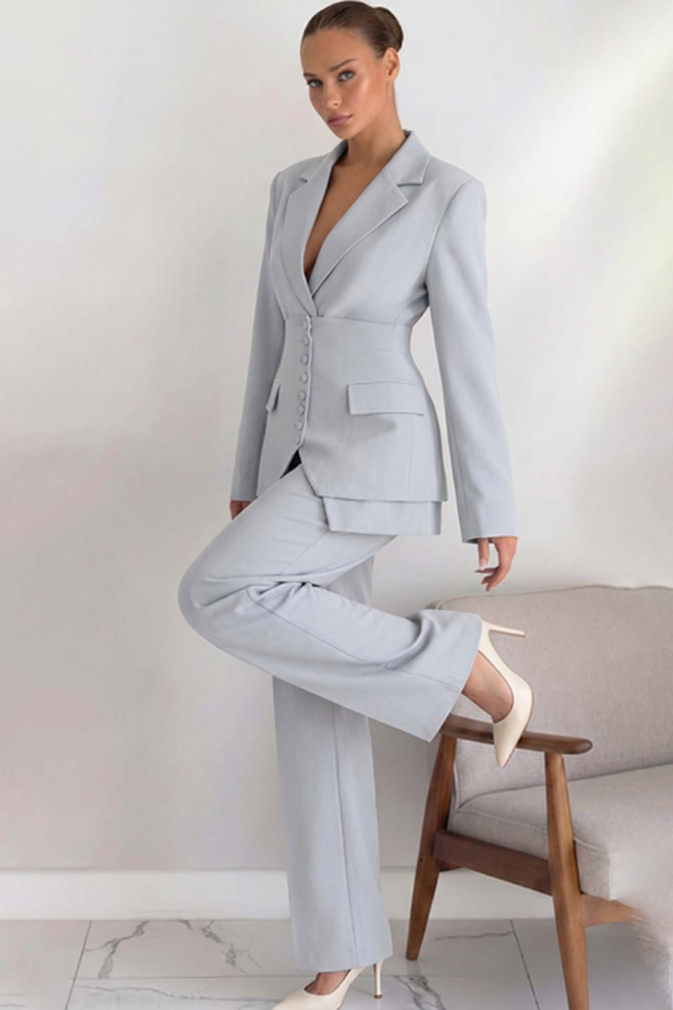 Σετ σακάκι παντελόνι. Το σακάκι διακρίνεται για τη μεσάτη γραμμή του, η οποία τονίζεται από ένα εντυπωσιακό κλείσιμο με πολλαπλά ντυμένα κουμπιά στο κέντρο, δημιουργώντας ένα “corset effect” που σμιλεύει τη σιλουέτα. Συνοδεύεται από ψηλόμεσο παντελόνι σε ίσια ή ελαφρώς wide-leg γραμμή, προσφέροντας άνεση και επιμήκυνση της σιλουέτας.