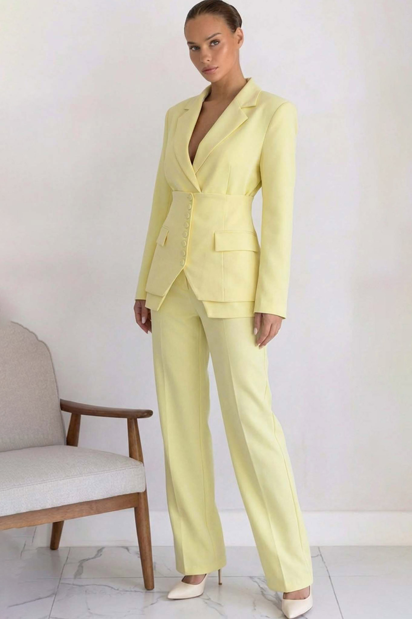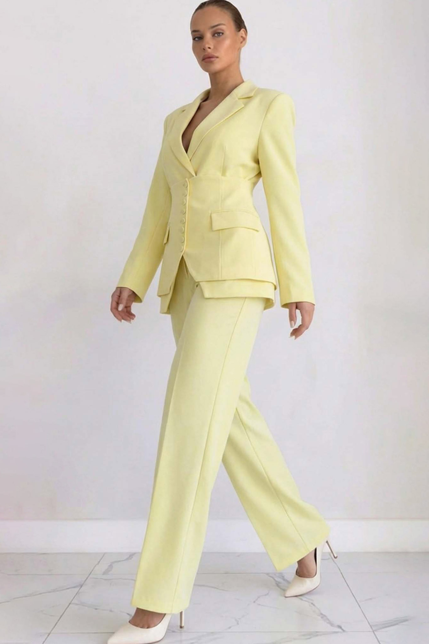 Σετ σακάκι παντελόνι. Το σακάκι διακρίνεται για τη μεσάτη γραμμή του, η οποία τονίζεται από ένα εντυπωσιακό κλείσιμο με πολλαπλά ντυμένα κουμπιά στο κέντρο, δημιουργώντας ένα “corset effect” που σμιλεύει τη σιλουέτα. Συνοδεύεται από ψηλόμεσο παντελόνι σε ίσια ή ελαφρώς wide-leg γραμμή, προσφέροντας άνεση και επιμήκυνση της σιλουέτας.