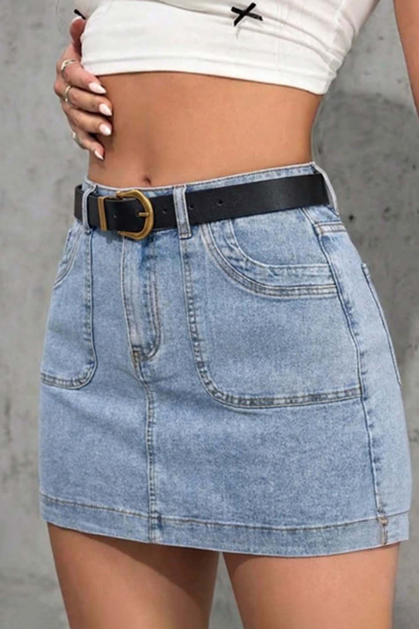 Tζιν μίνι φούστα αποτελεί ένα διαχρονικό κομμάτι με μοντέρνες χρηστικές λεπτομέρειες. Ξεχωρίζει για τις μεγάλες εξωτερικές τσέπες στο μπροστινό μέρος, οι οποίες προσδίδουν έναν ελαφρώς cargo χαρακτήρα, ενώ η στενή, ίσια γραμμή της αναδεικνύει τη σιλουέτα.