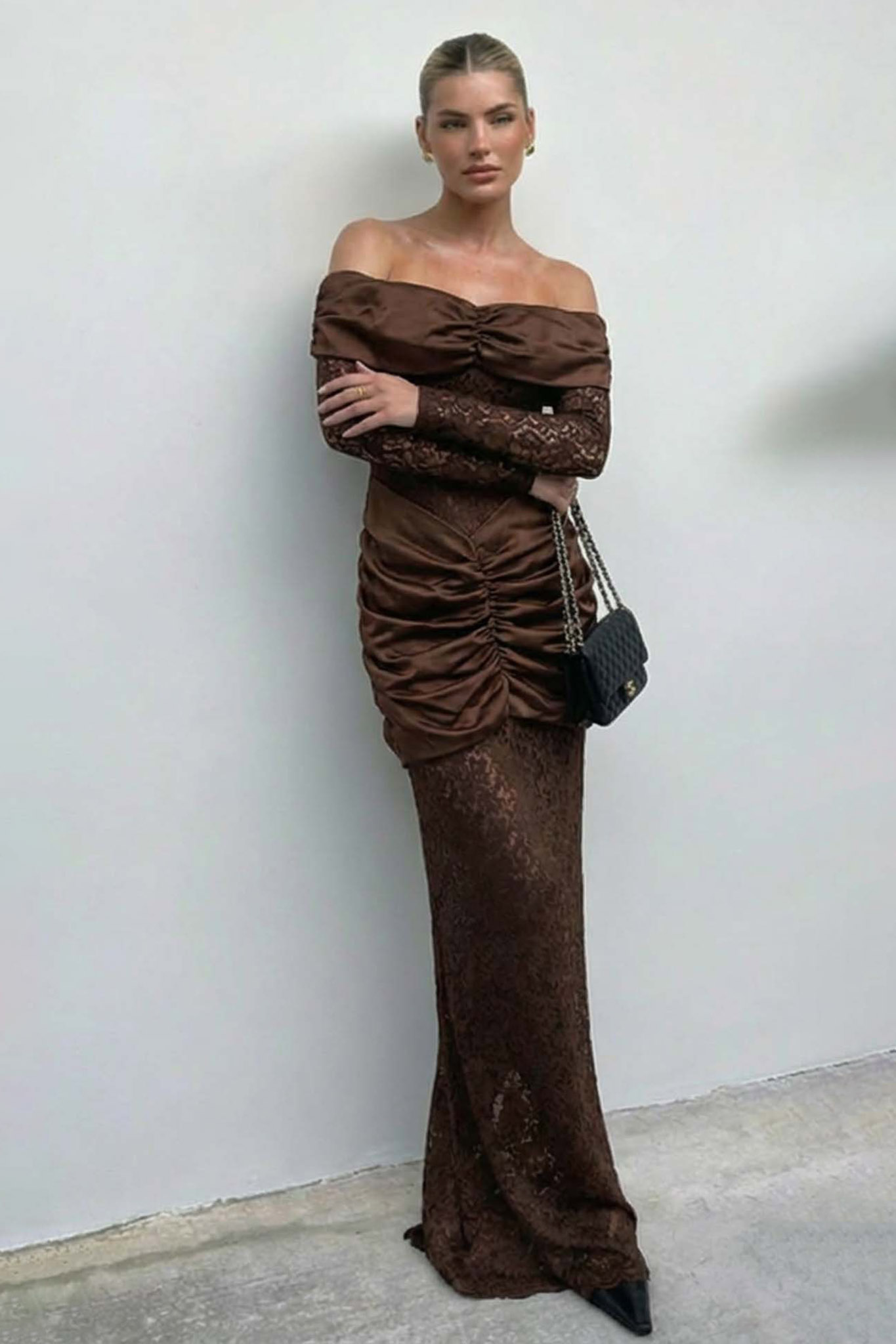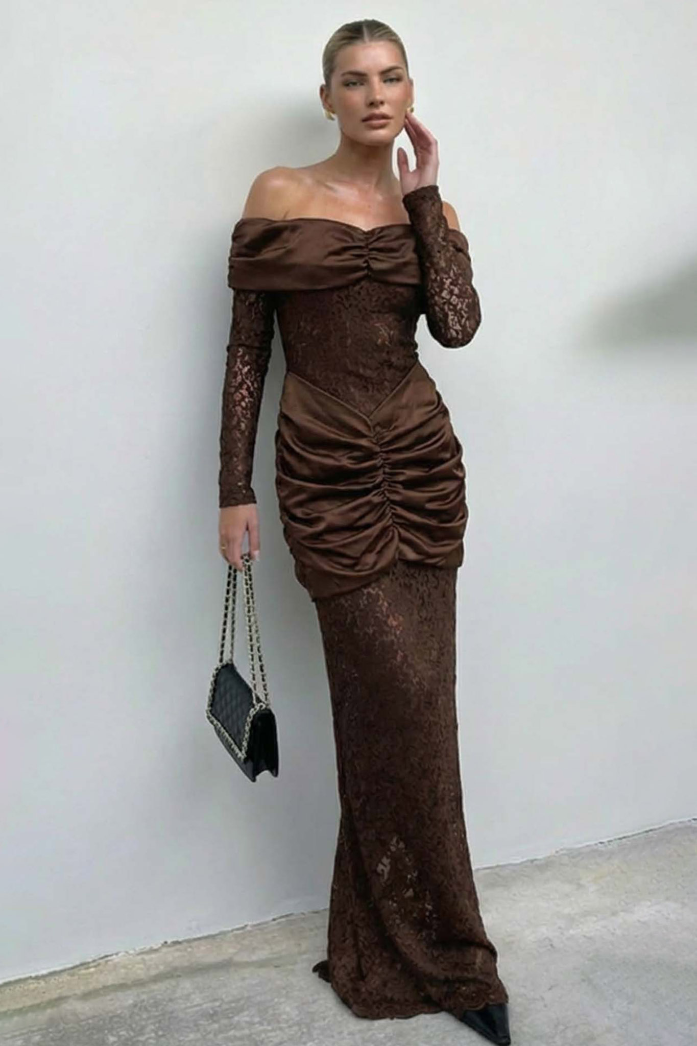 Mάξι φόρεμα αποτελεί την απόλυτη επιλογή για μια εντυπωσιακή βραδινή εμφάνιση, συνδυάζοντας την κλασική γοητεία της δαντέλας με μοντέρνες, αισθησιακές λεπτομέρειες. Το φόρεμα διαθέτει έξωμο (off-shoulder) σχέδιο με ντραπέ μπούστο και μακριά μανίκια από δαντέλα, ενώ η εφαρμοστή γοργονέ γραμμή του αναδεικνύει μοναδικά τη σιλουέτα. Η διαφάνεια της δαντέλας σε συνδυασμό με το πλούσιο μπορντό/βουργουνδί χρώμα και τις ντραπέ λεπτομέρειες στη μέση προσφέρουν ένα αριστοκρατικό και θηλυκό αποτέλεσμα, ιδανικό για γάμους, δεξιώσεις ή επίσημες περιστάσεις.