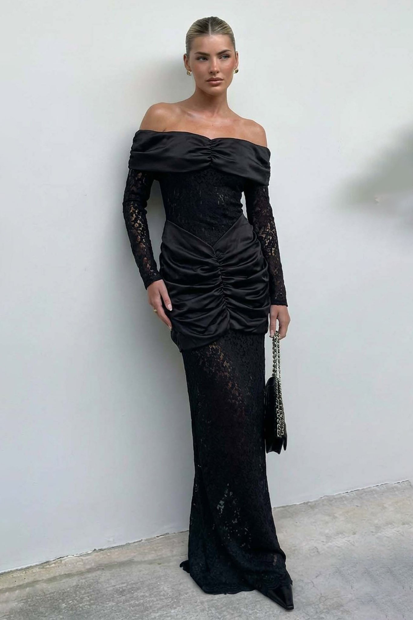 Mάξι φόρεμα αποτελεί την απόλυτη επιλογή για μια εντυπωσιακή βραδινή εμφάνιση, συνδυάζοντας την κλασική γοητεία της δαντέλας με μοντέρνες, αισθησιακές λεπτομέρειες. Το φόρεμα διαθέτει έξωμο (off-shoulder) σχέδιο με ντραπέ μπούστο και μακριά μανίκια από δαντέλα, ενώ η εφαρμοστή γοργονέ γραμμή του αναδεικνύει μοναδικά τη σιλουέτα. Η διαφάνεια της δαντέλας σε συνδυασμό με το πλούσιο μπορντό/βουργουνδί χρώμα και τις ντραπέ λεπτομέρειες στη μέση προσφέρουν ένα αριστοκρατικό και θηλυκό αποτέλεσμα, ιδανικό για γάμους, δεξιώσεις ή επίσημες περιστάσεις.